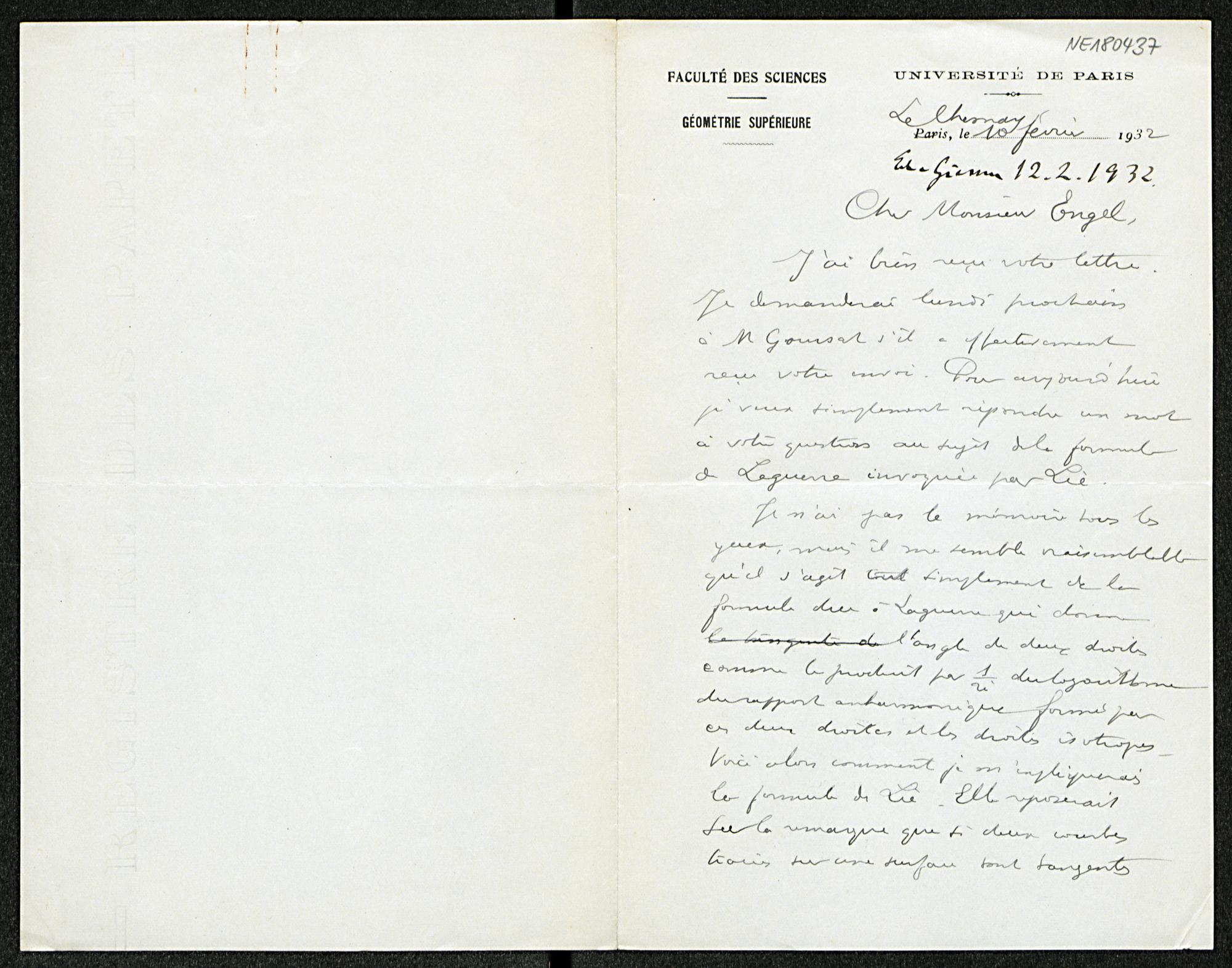 Brief von Élie Cartan an Friedrich Engel vom 10.2.1932