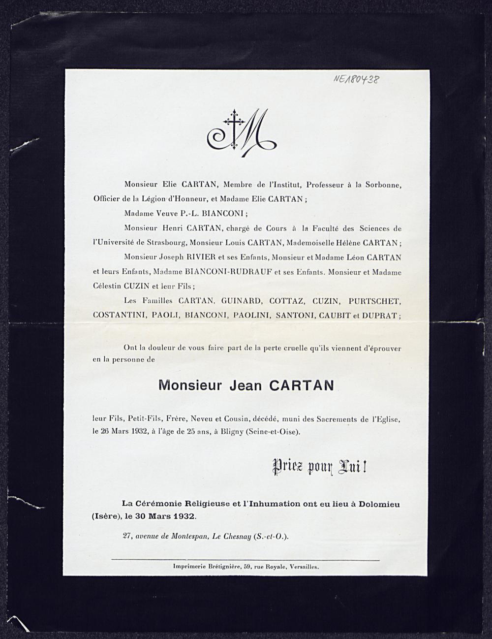 Todesanzeige für Jean Cartan, Sohn von Élie Cartan vom 26.3.1932