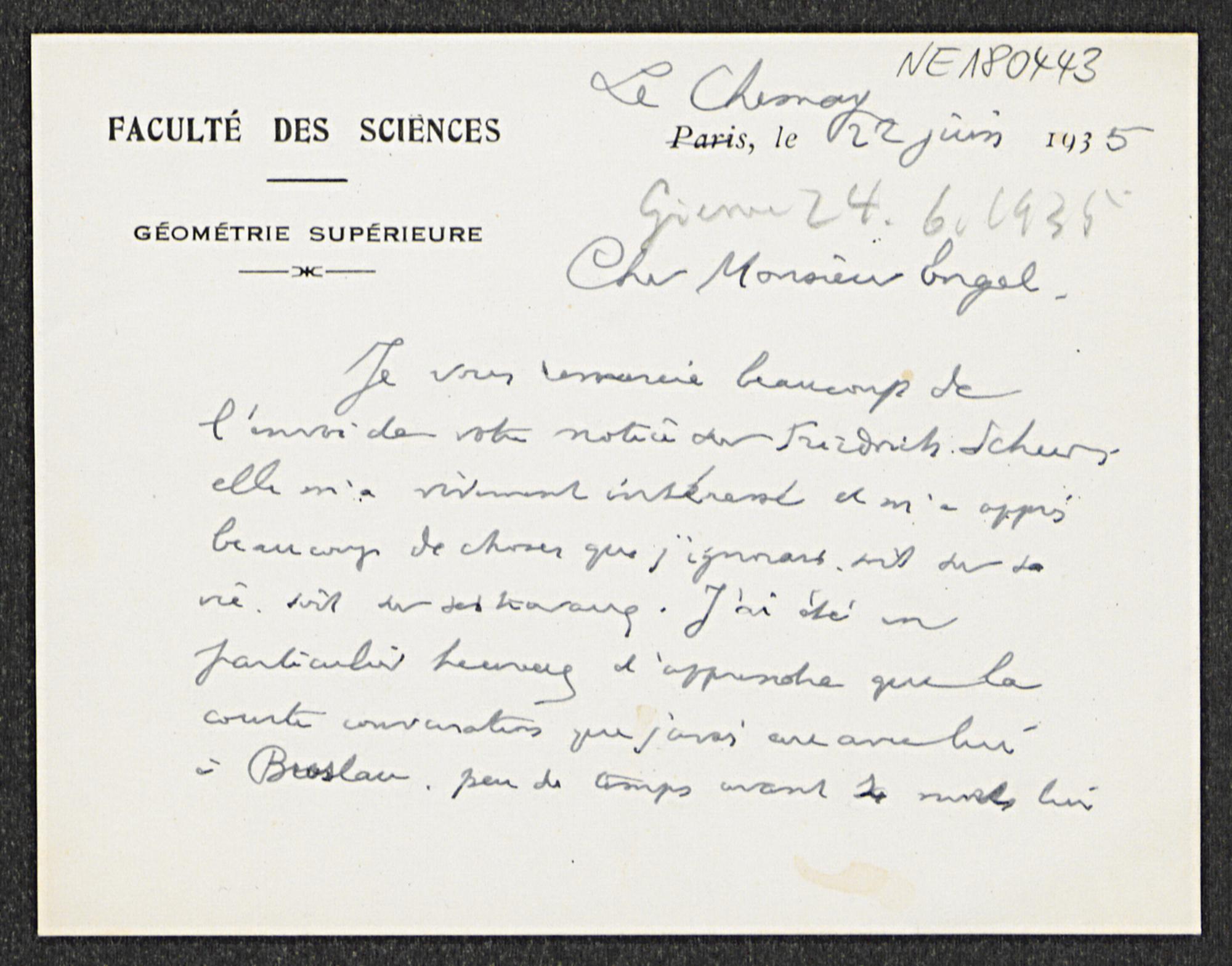Briefkarte von Élie Cartan an Friedrich Engel vom 22.6.1935