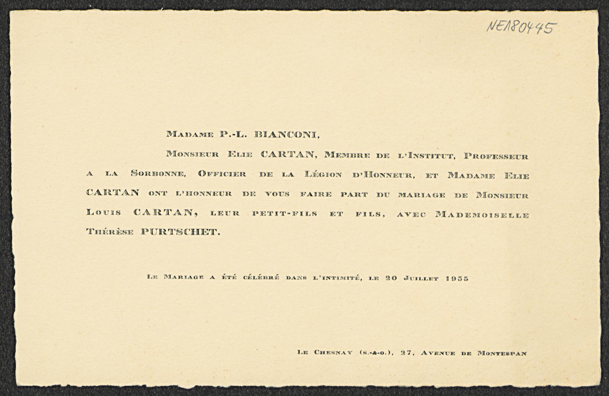 Heiratsanzeige von Thérèse Purtschet und Louis Cartan, Sohn von Élie Cartan vom 20.7.1935