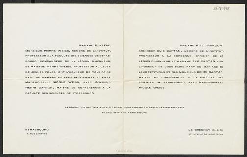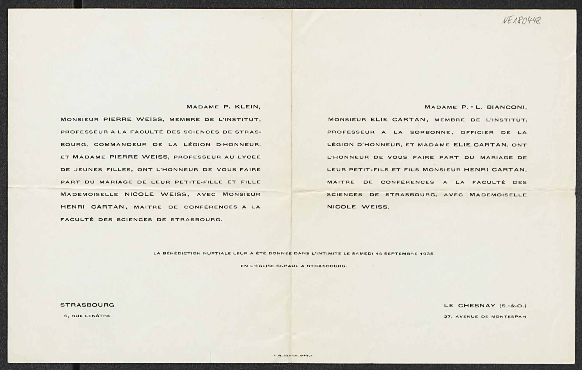 Heiratsanzeige von Nicole Weiss und Henri Cartan vom 14.9.1935