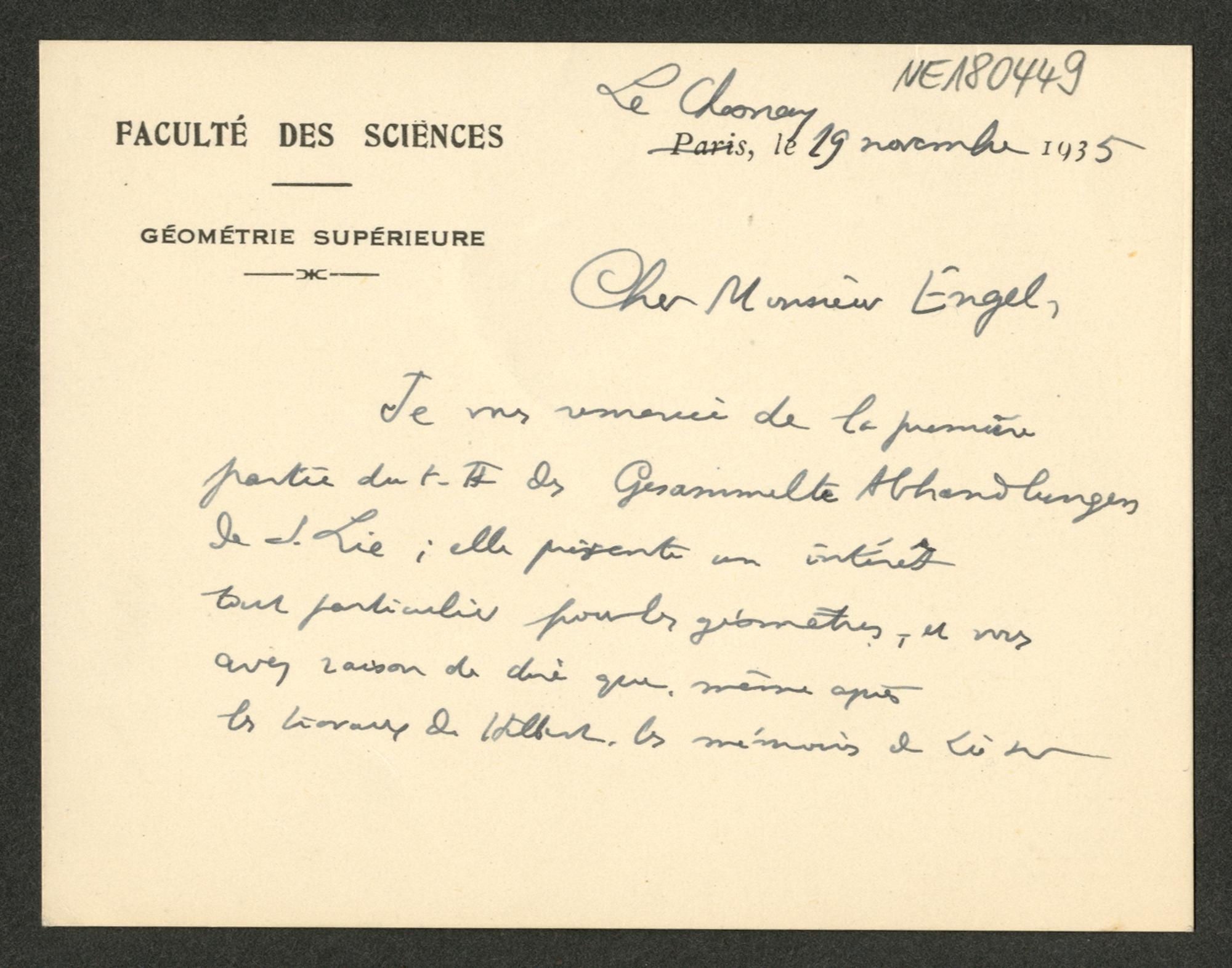 Briefkarte von Élie Cartan an Friedrich Engel vom 19.11.1935