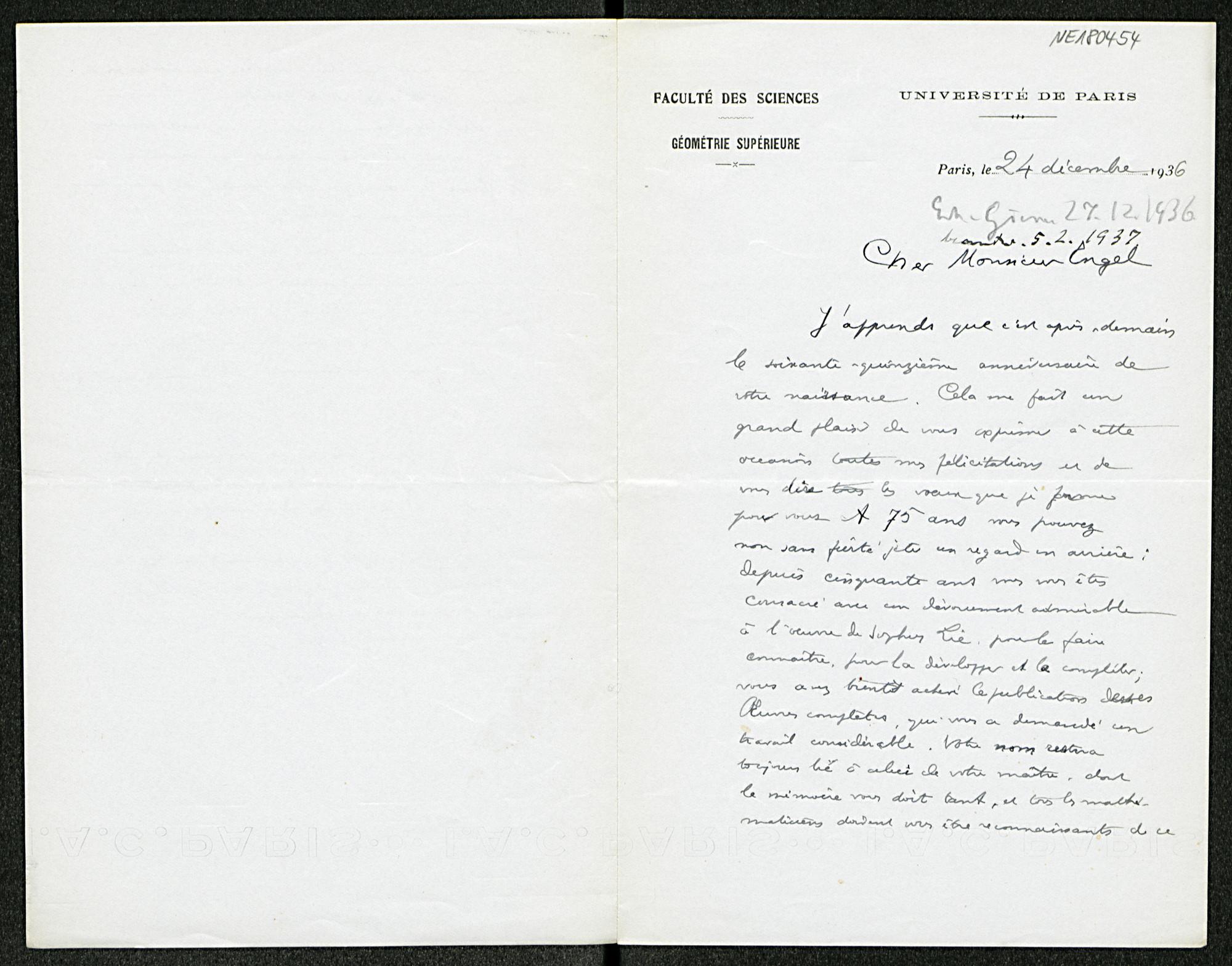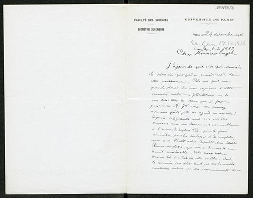 Brief von Élie Cartan an Friedrich Engel vom 24.12.1936