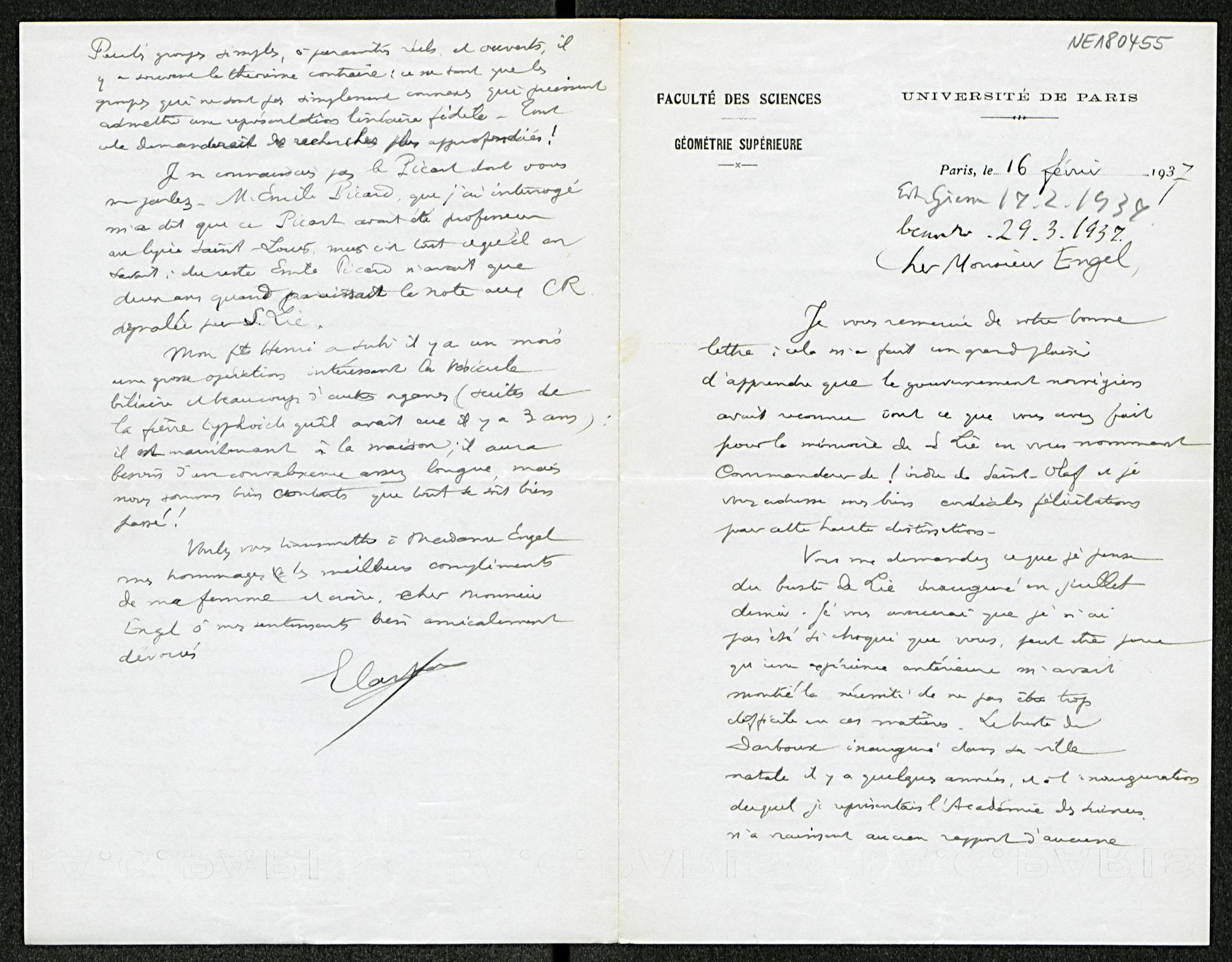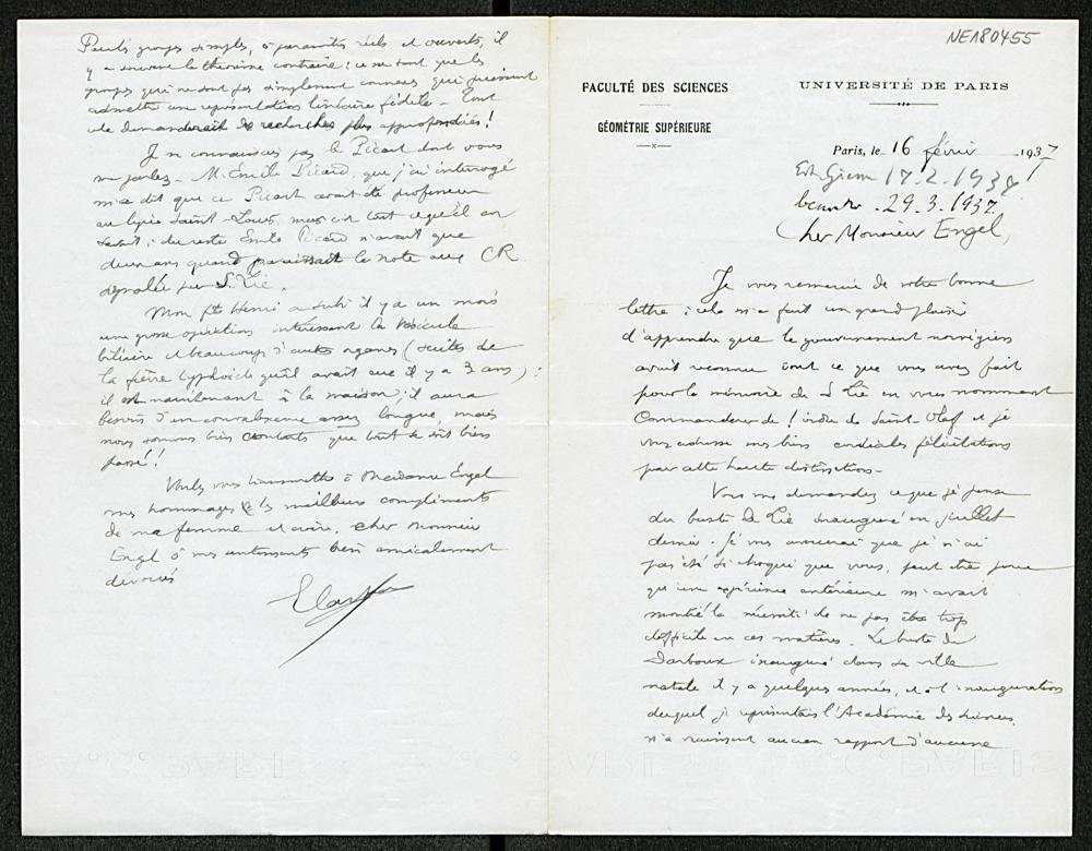 Brief von Élie Cartan an Friedrich Engel vom 16.2.1937