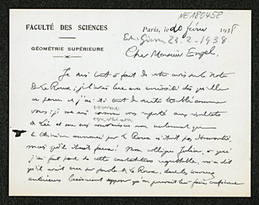 Briefkarte von Élie Cartan an Friedrich Engel vom 20.2.1938