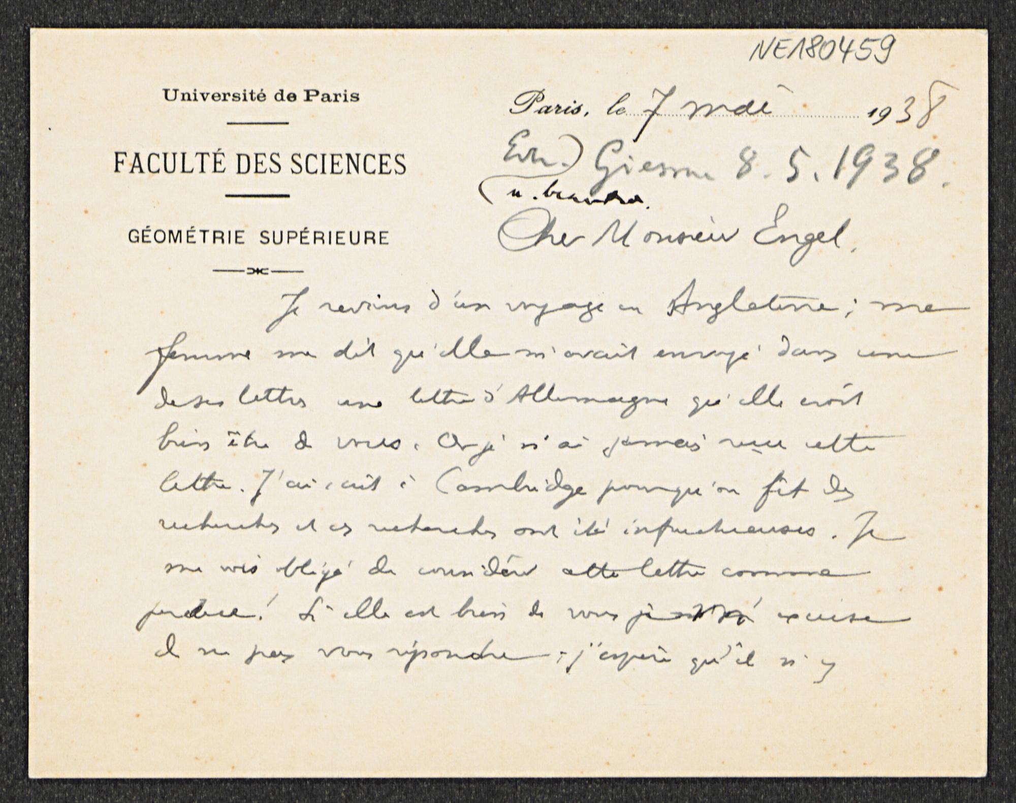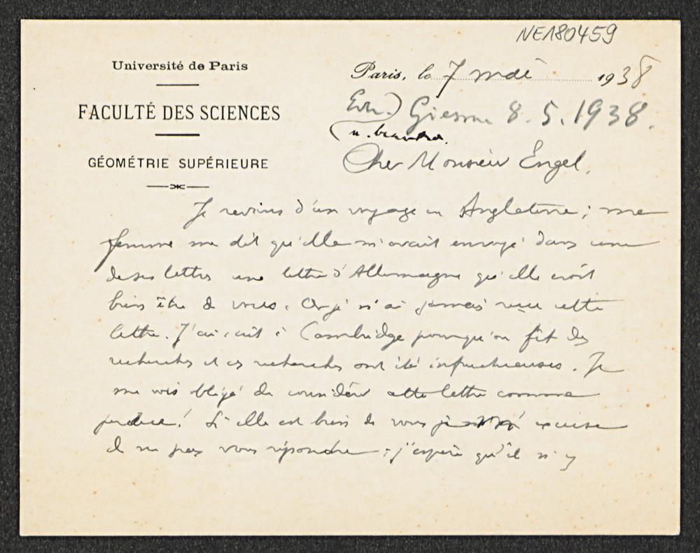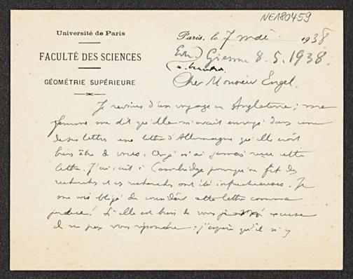 Briefkarte von Élie Cartan an Friedrich Engel vom 7.5.1938