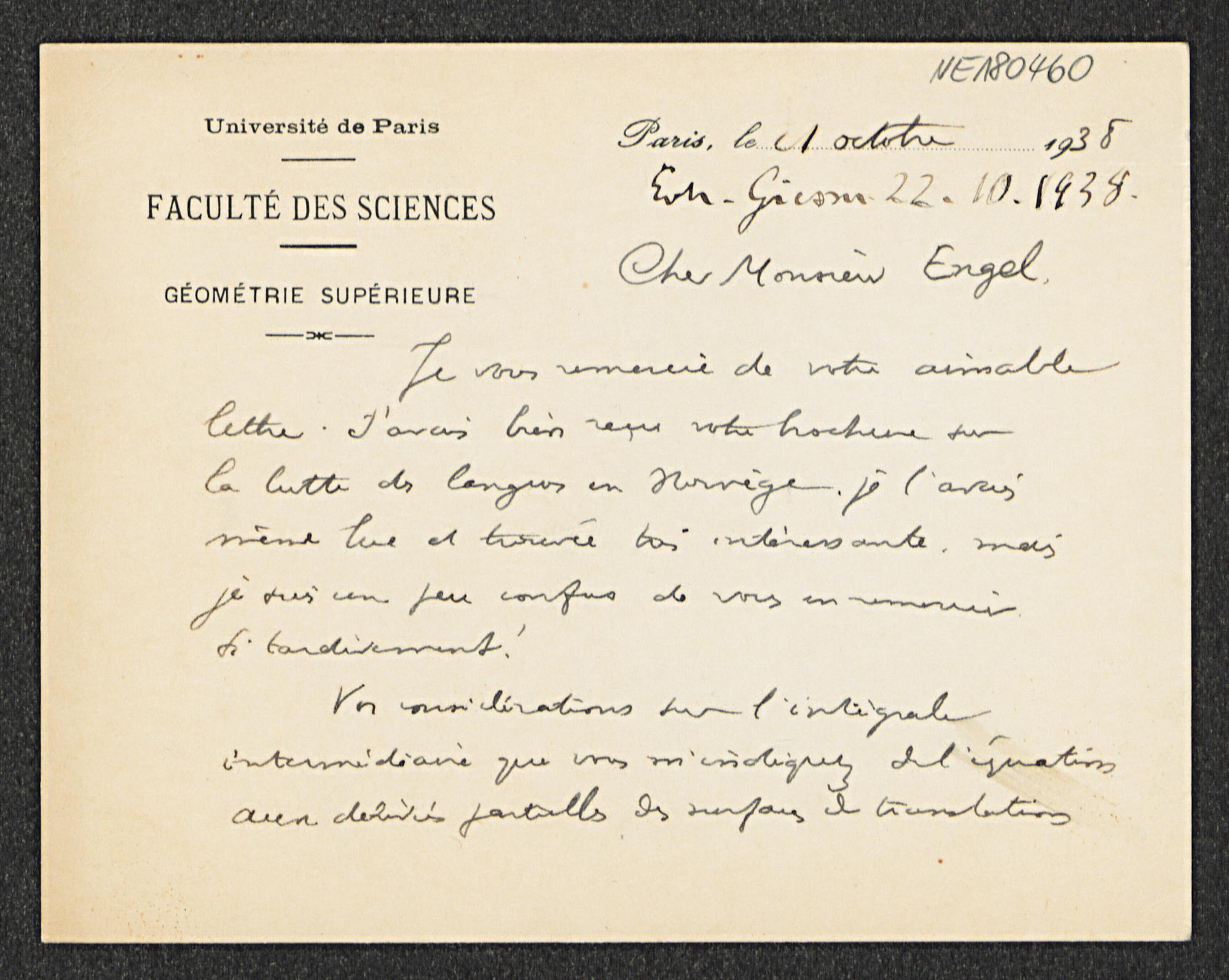 Briefkarte von Élie Cartan an Friedrich Engel vom 21.10.1938