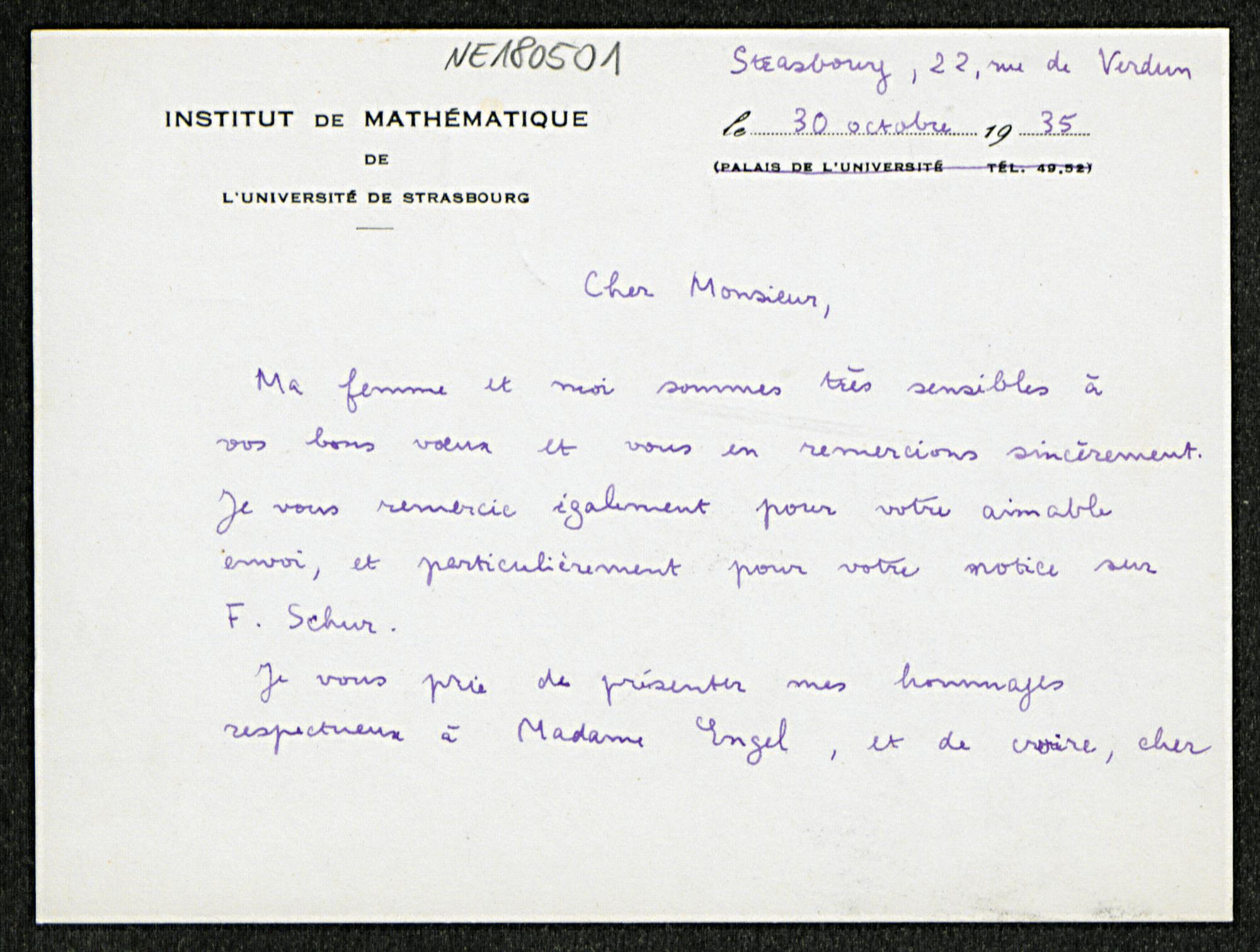 Briefkarte von Henri Cartan an Friedrich Engel vom 30.10.1935