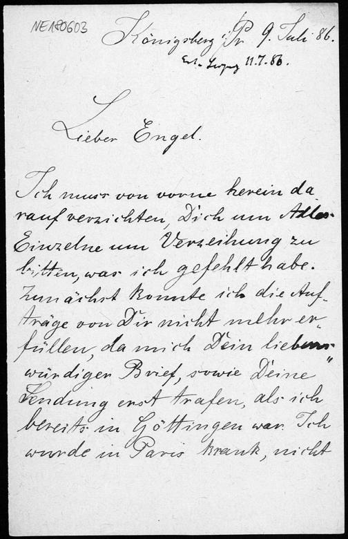 Brief von David Hilbert an Friedrich Engel vom 9.7.1886