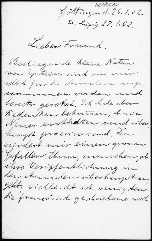 Brief von David Hilbert an Friedrich Engel vom 26.1.1902
