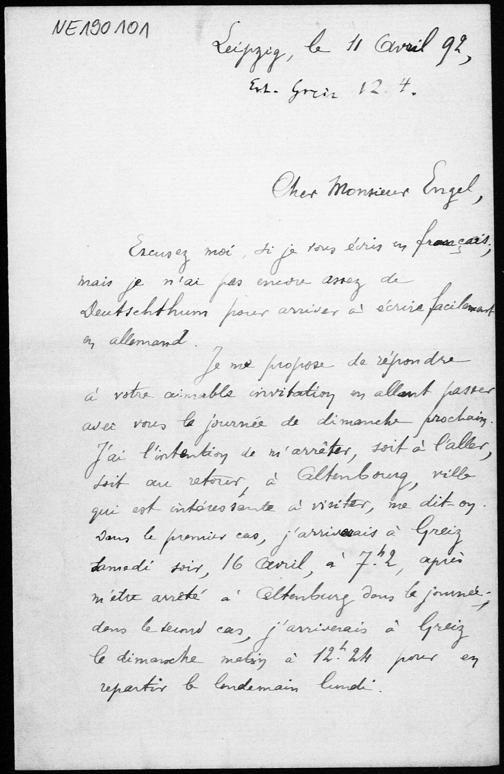Brief von Arthur Tresse an Friedrich Engel vom 11.4.1892