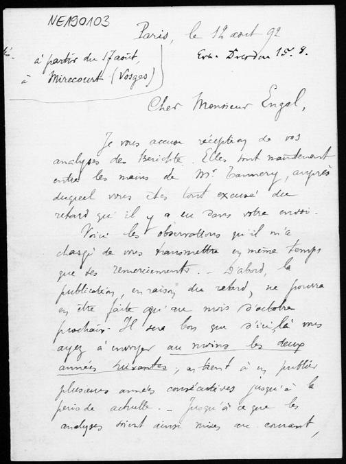 Brief von Arthur Tresse an Friedrich Engel vom 12.8.1892