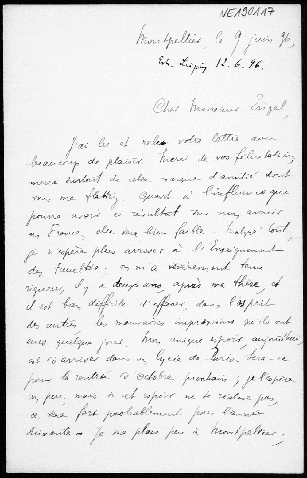 Brief von Arthur Tresse an Friedrich Engel vom 9.6.1896