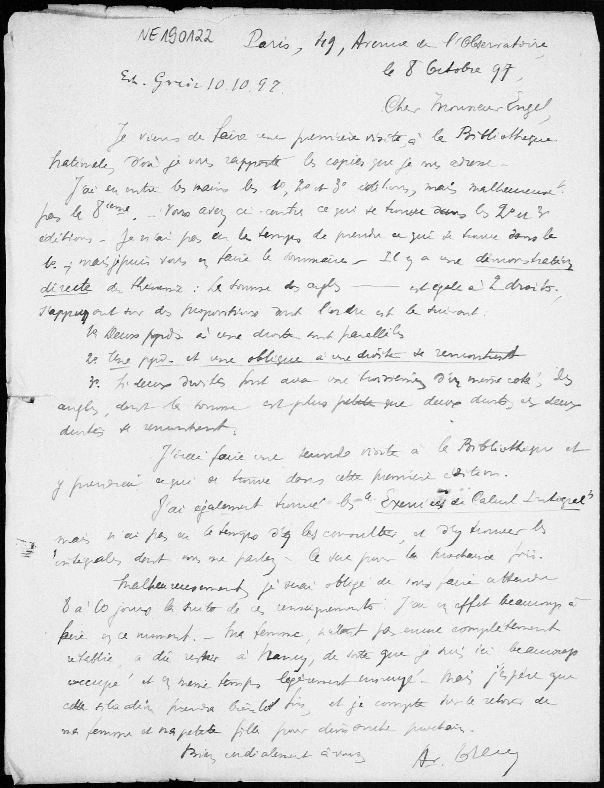 Brief von Arthur Tresse an Friedrich Engel vom 8.10.1897