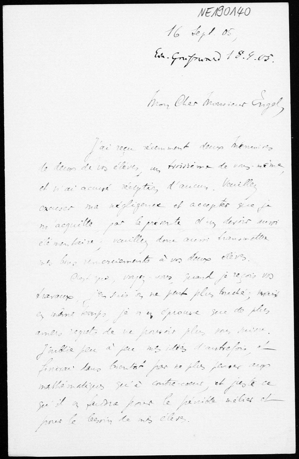 Brief von Arthur Tresse an Friedrich Engel vom 16.9.1905