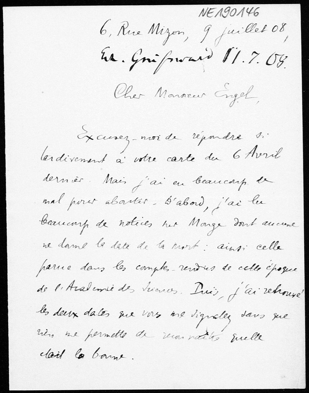 Brief von Arthur Tresse an Friedrich Engel vom 9.7.1908