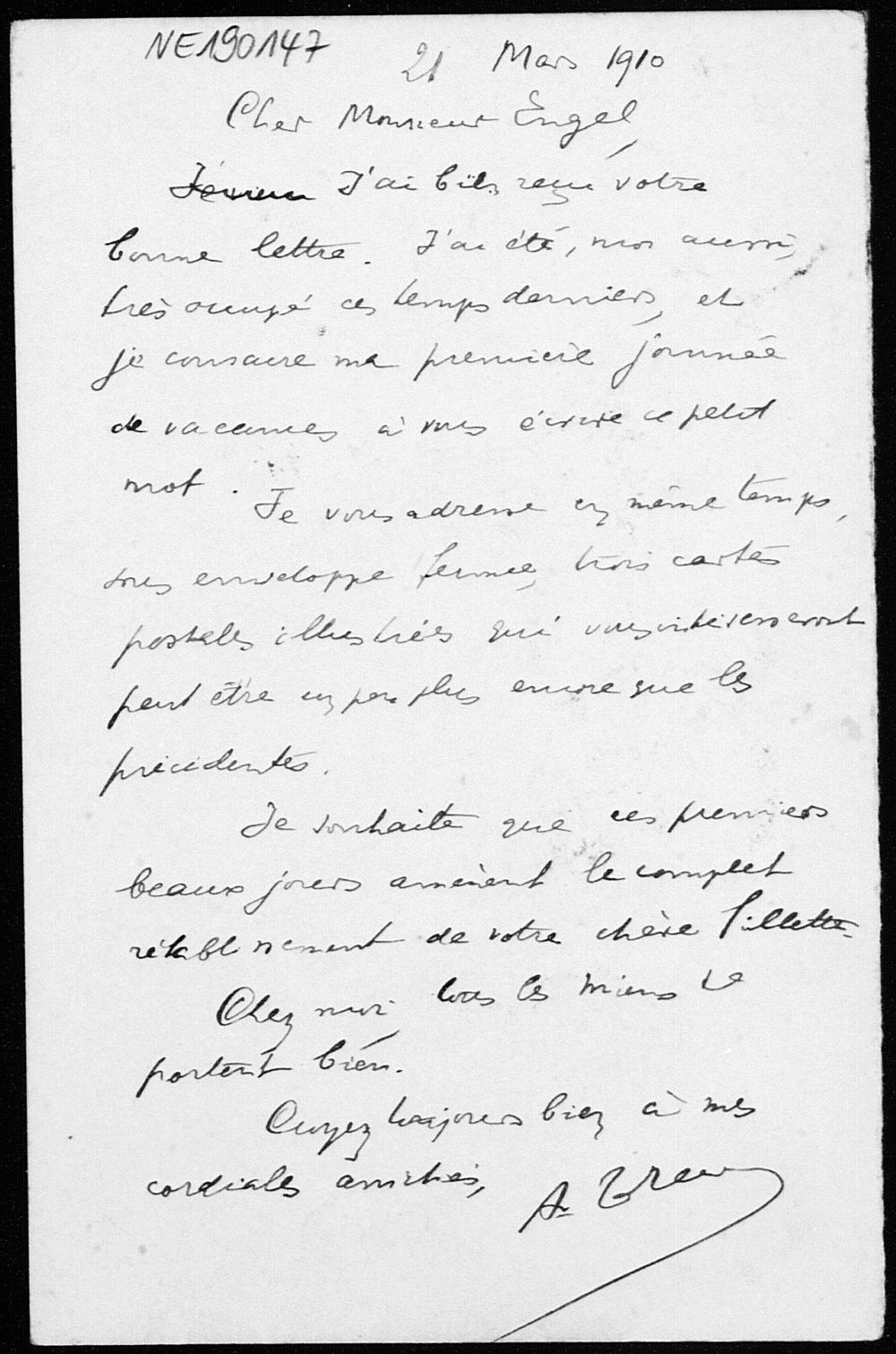 Postkarte von Arthur Tresse an Friedrich Engel vom 21.3.1910