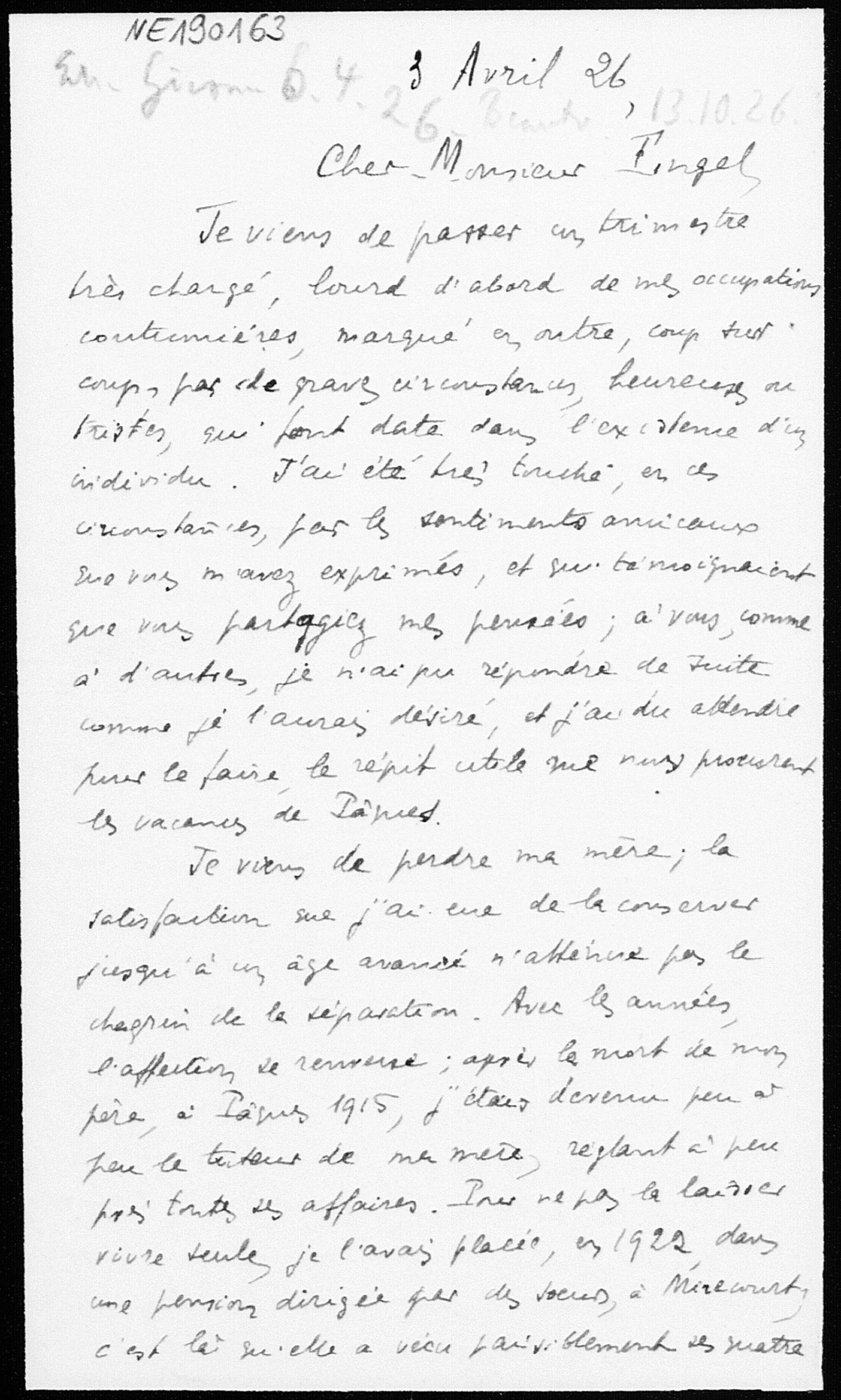 Brief von Arthur Tresse an Friedrich Engel vom 3.4.1926
