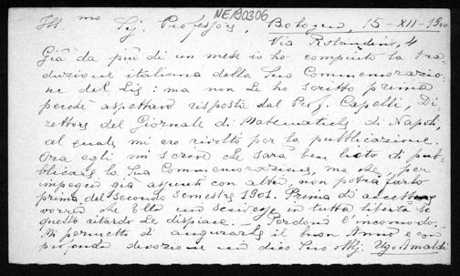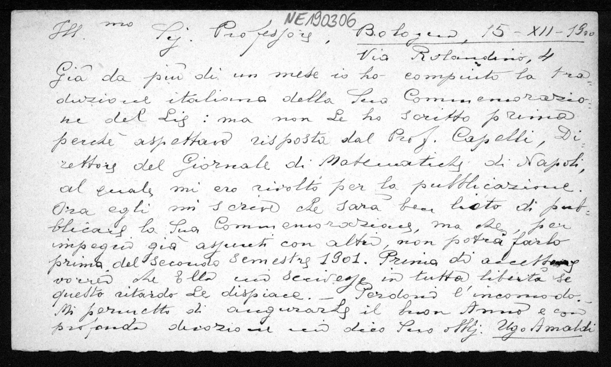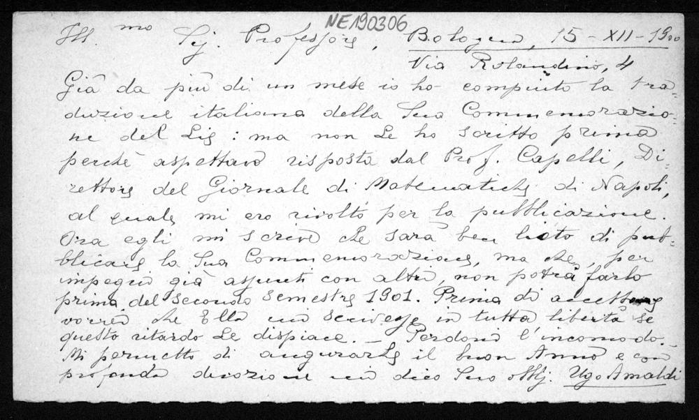 Postkarte von Ugo Amaldi an Friedrich Engel vom 15.12.1900