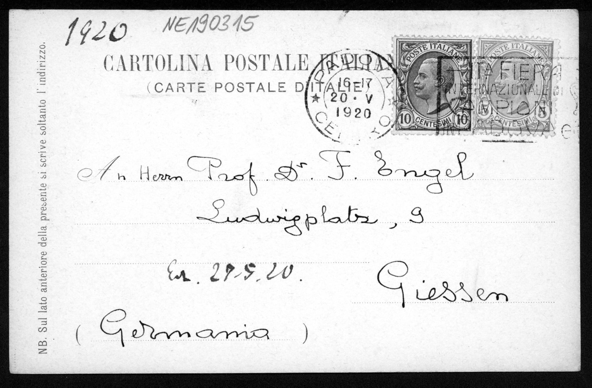 Ansichtskarte von Ugo Amaldi an Friedrich Engel vom 20.5.1920