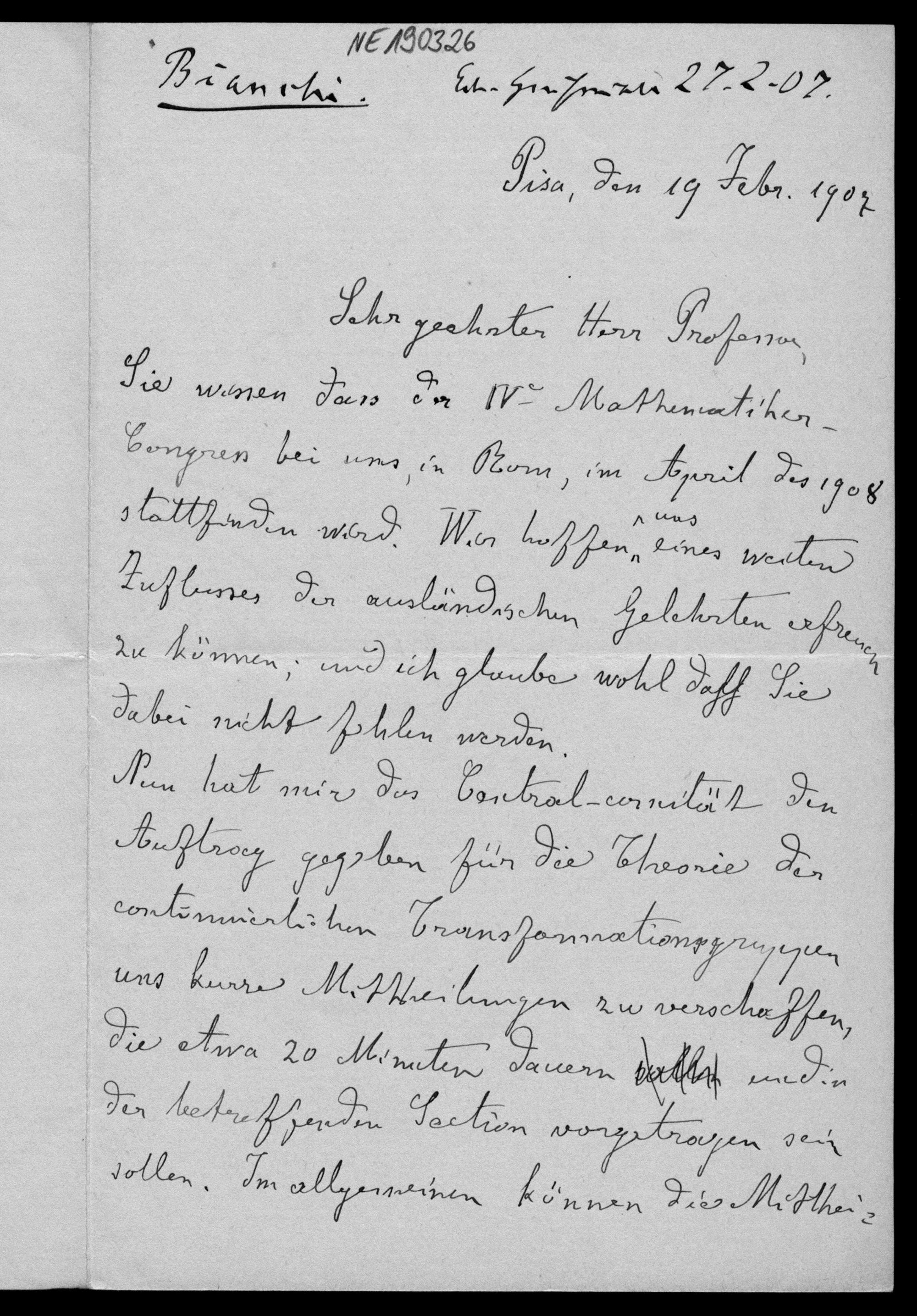 Brief von Luigi Bianchi an Friedrich Engel vom 19.2.1907