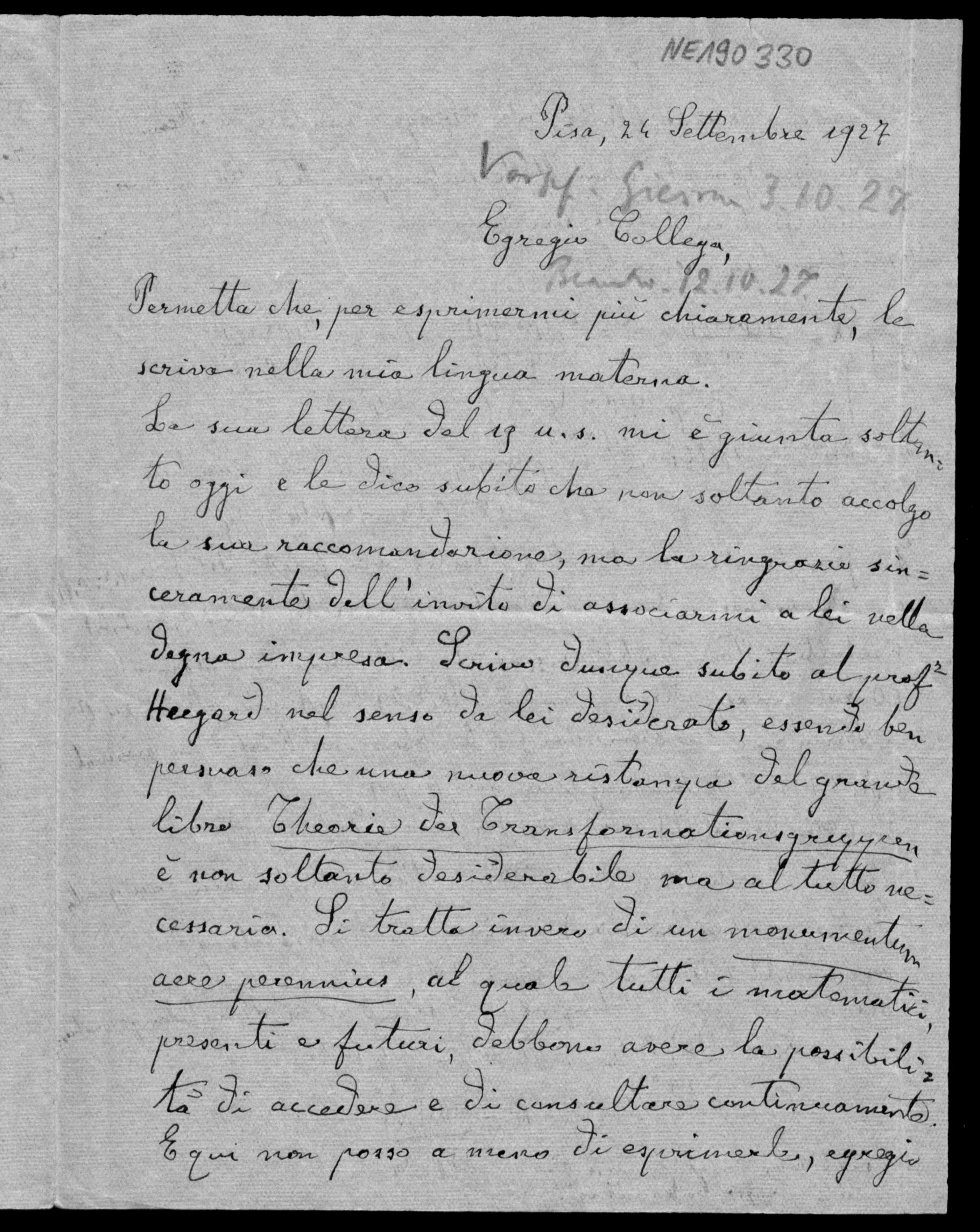 Brief von Luigi Bianchi an Friedrich Engel vom 24.9.1927