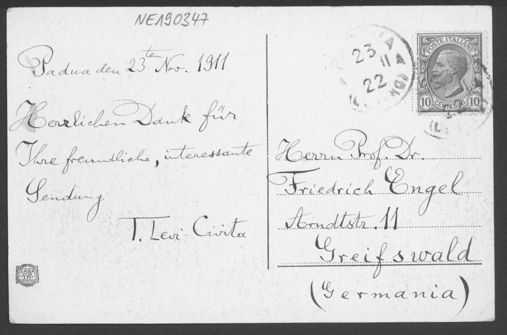 Ansichtskarte von Tullio Levi-Civita an Friedrich Engel vom 23.11.1911