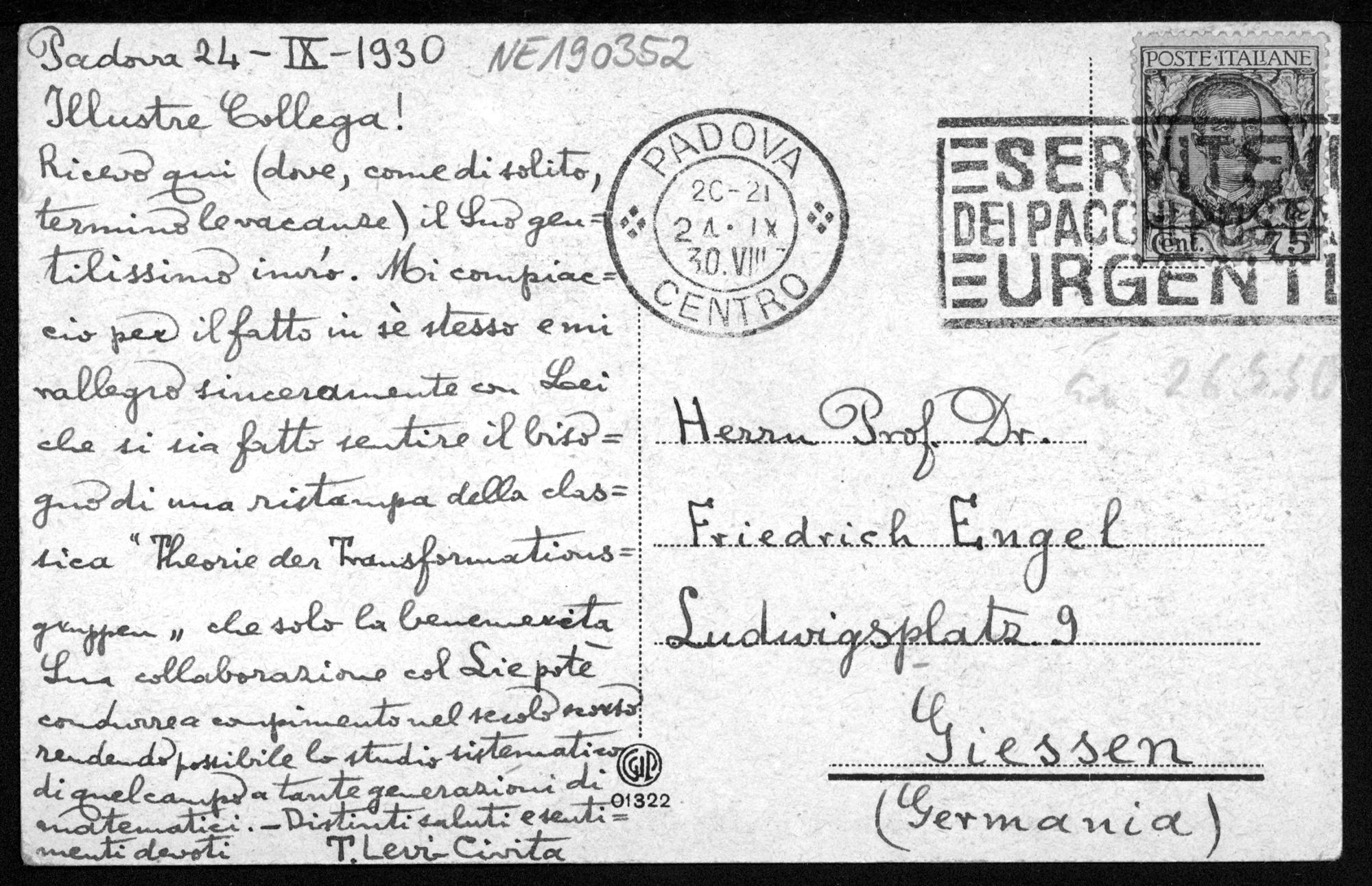 Ansichtskarte von Tullio Levi-Civita an Friedrich Engel vom 24.9.1930