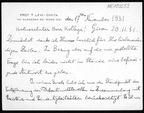 Briefkarte von Tullio Levi-Civita an Friedrich Engel vom 17.11.1931