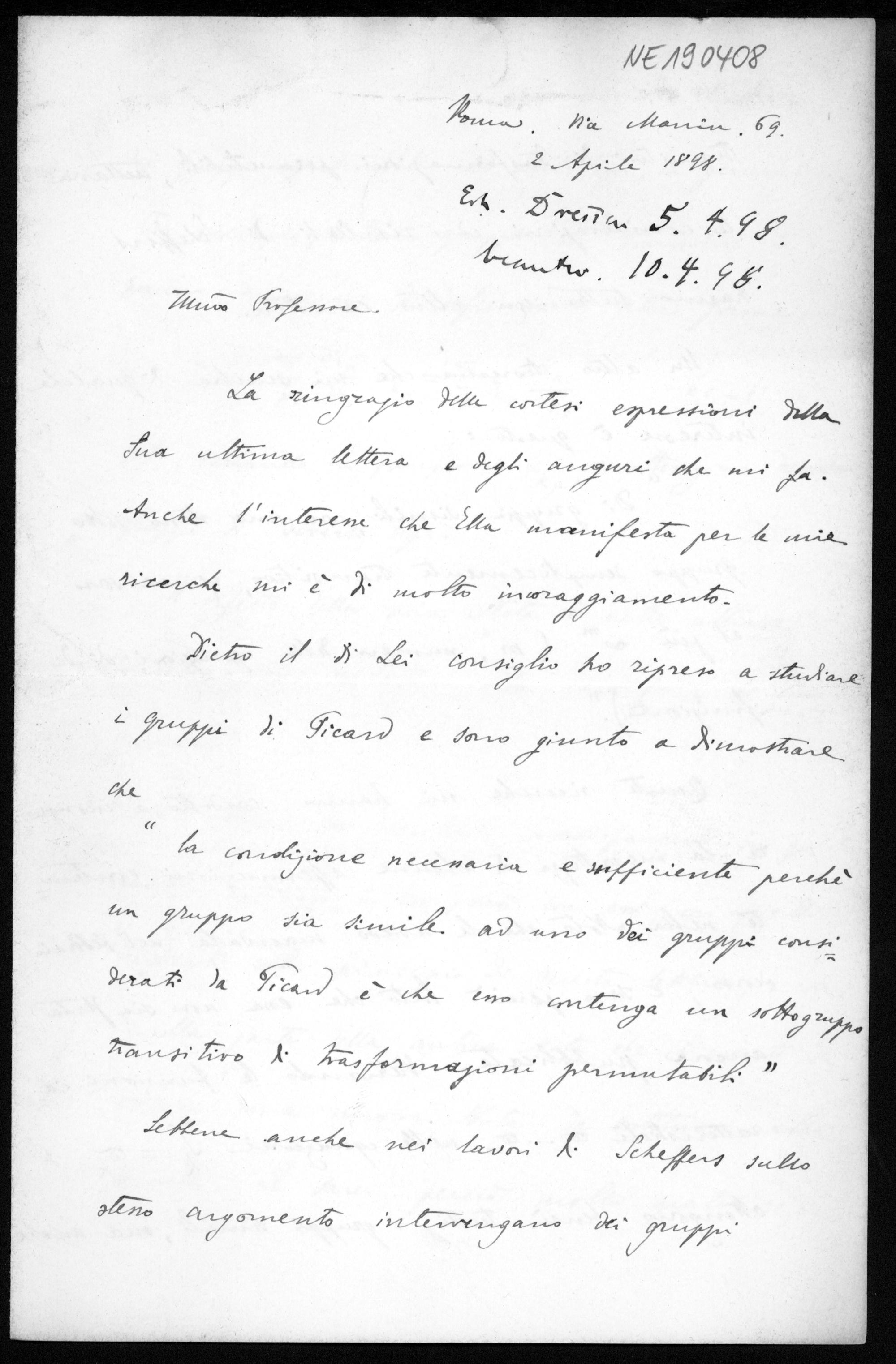 Brief von Paolo Medolaghi an Friedrich Engel vom 2.4.1898