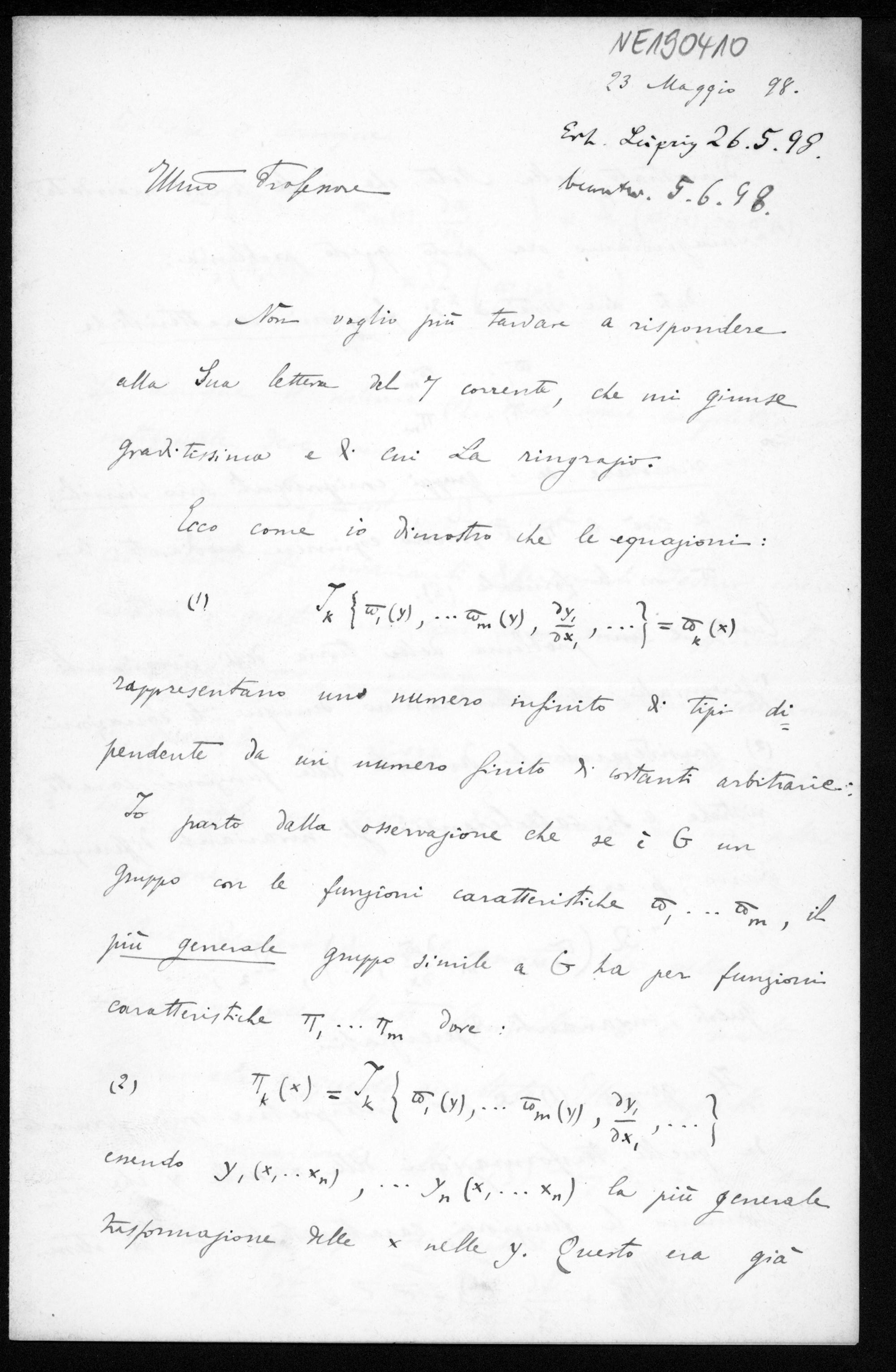 Brief von Paolo Medolaghi an Friedrich Engel vom 23.5.1898