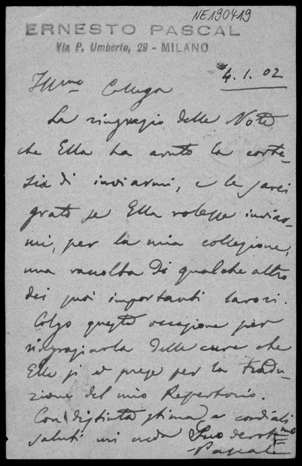 Postkarte von Ernesto Pascal an Friedrich Engel vom 4.1.1902
