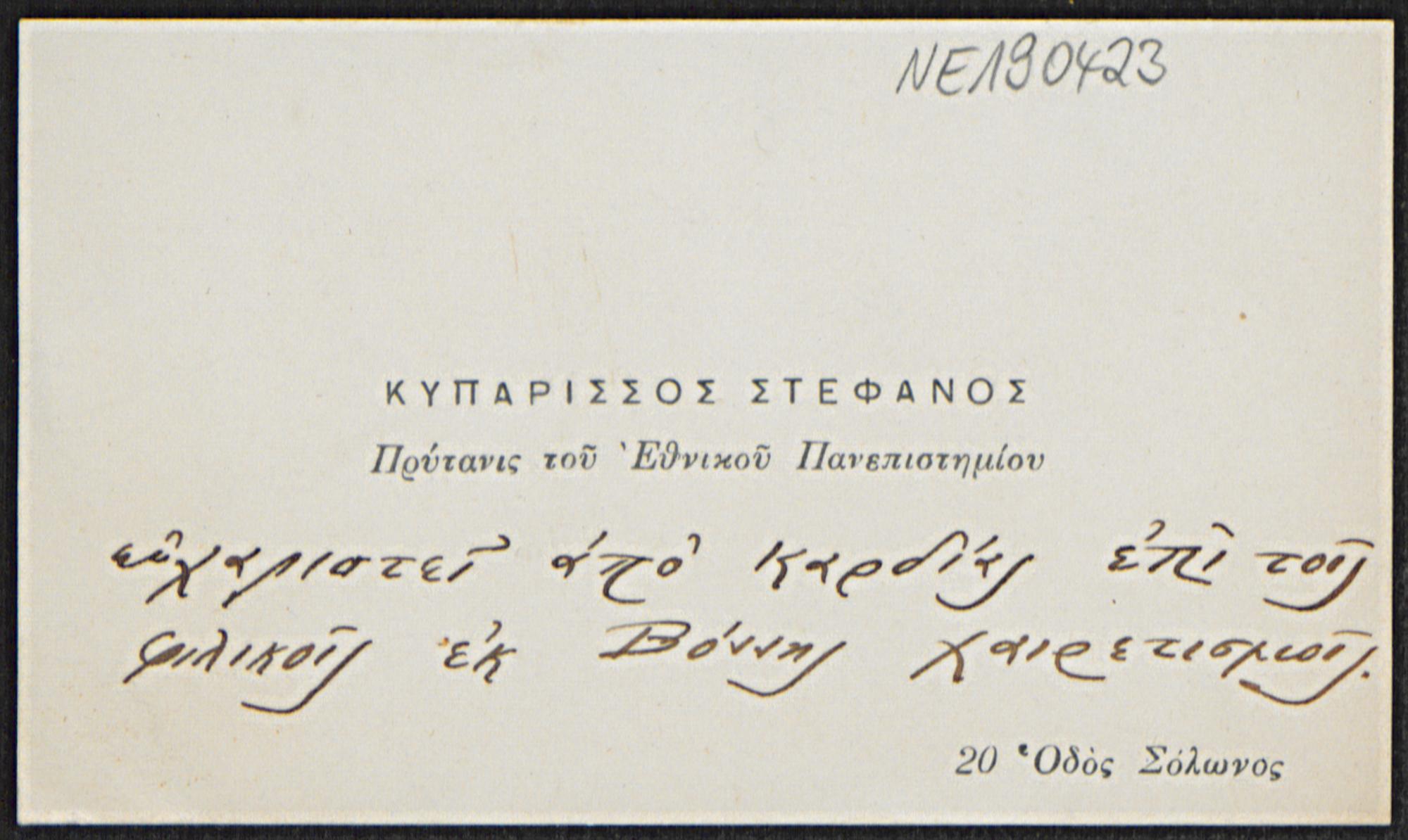 Visitenkarte von Cyparissos Stéphanos an Friedrich Engel, o.D