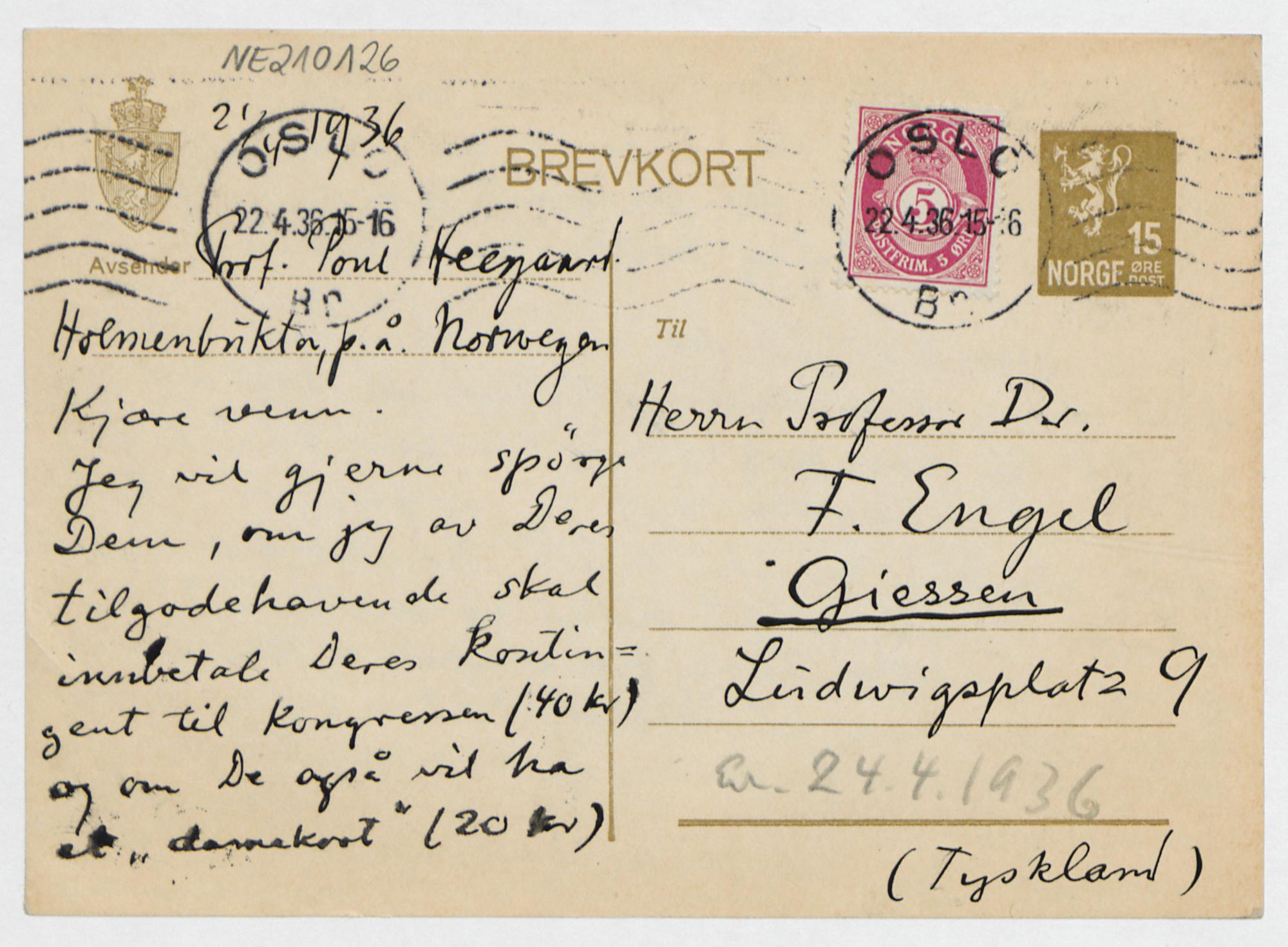 Postkarte von Poul Heegaard an Friedrich Engel vom 21.4.1936