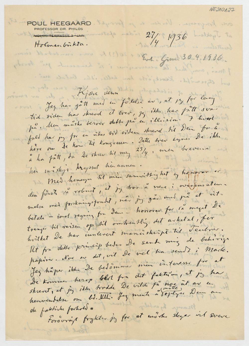 Brief von Poul Heegaard an Friedrich Engel vom 27.4.1936