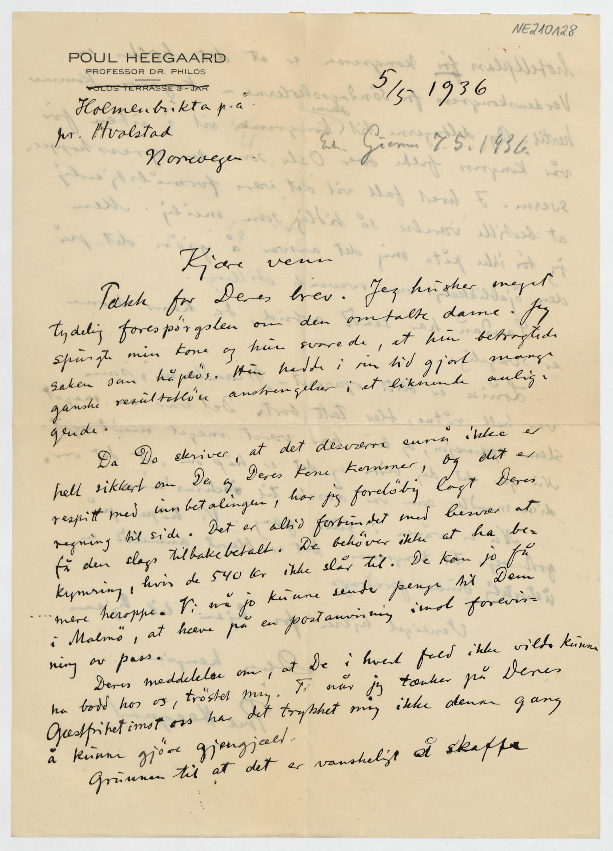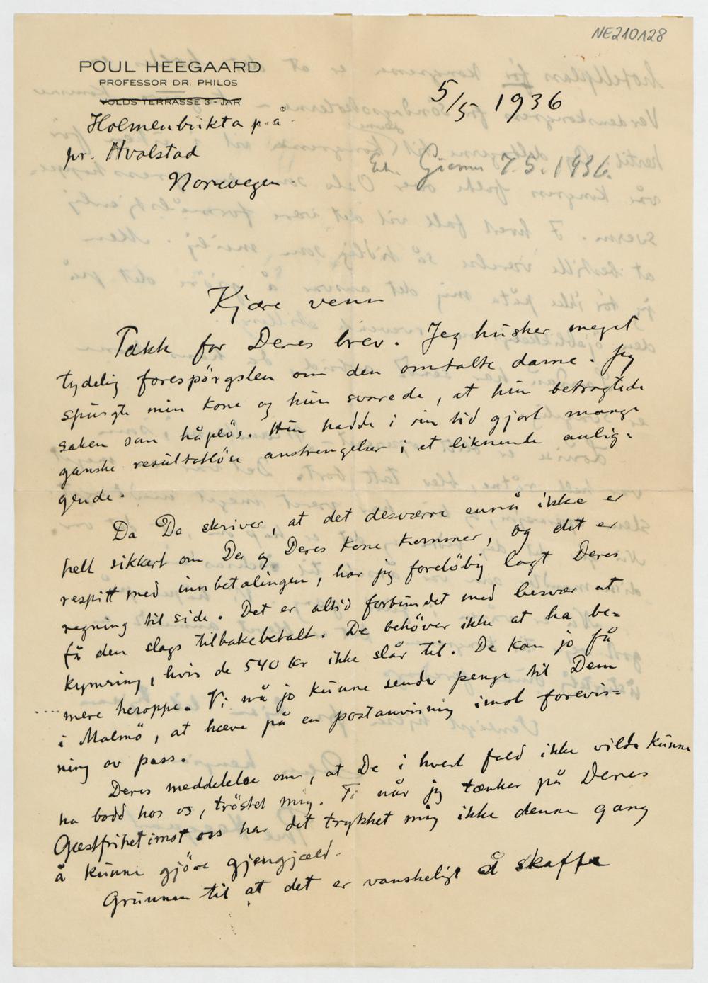 Brief von Poul Heegaard an Friedrich Engel vom 5.5.1936