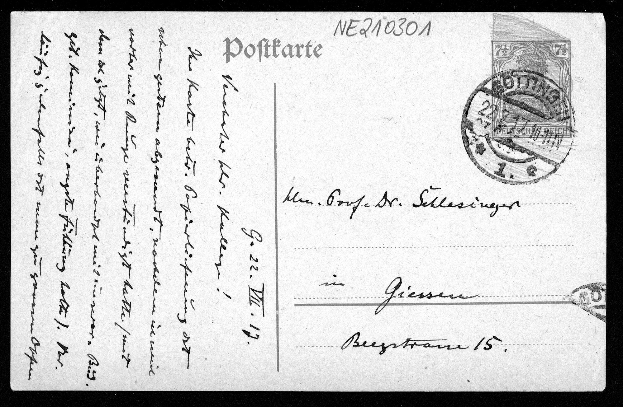 Postkarte von Felix Klein an Ludwig Schlesinger vom 22.7.1917