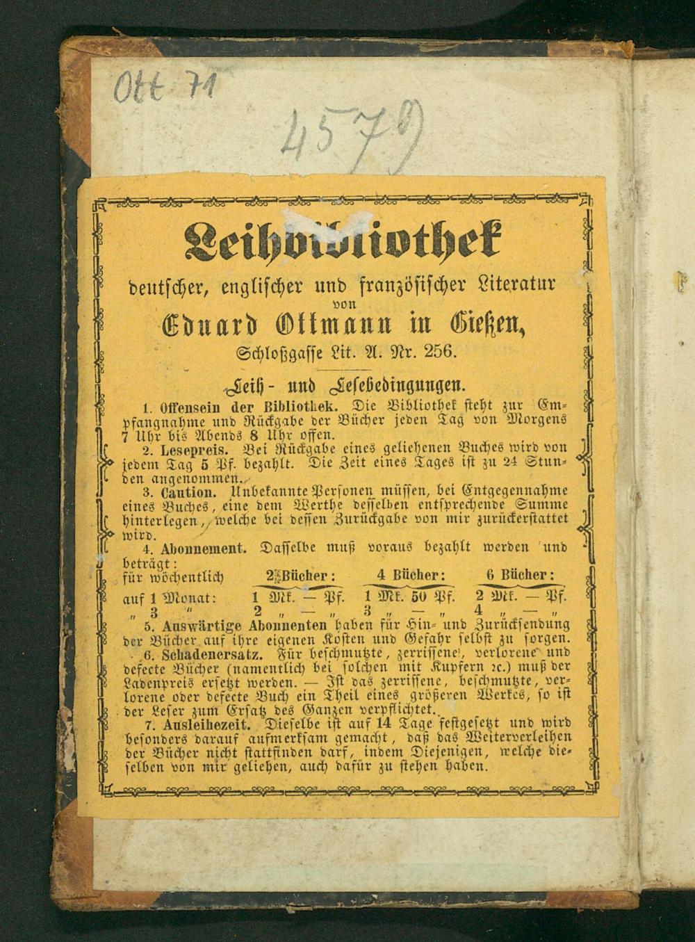 Eduard Ollmunn in Gießen, Schloßgaſſe Lit. A. Nr. 256 cLeih- und eſebedingungen. 1. offensein der Bibliothek. Die Bibliothek ſteht zur Em⸗ pfangnahme und Rückgabe der Bücher jeden Tag von Morgens