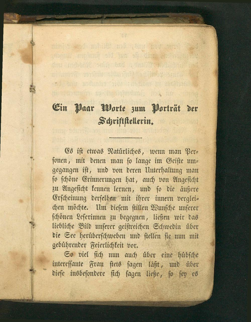 Es iſt etwas Natürliches, wenn man Per⸗ ſonen, mit denen man ſo lange im Geiſte um⸗ gegangen iſt, und von deren Unterhaltung man ſo ſchöne Erinnerungen hat, auch von Angeſicht zu Angeſicht kennen lernen, und ſo die äußere Erſcheinung derſelben mit ihrer innern verglei⸗ chen möchte. Um dieſem ſtillen Wunſche unſerer ſchönen Leſerinnen zu begegnen, ließen wir das liebliche Bild unſerer geiſtreichen Schwedin über die See herüberſchweben und ſtellen ſie nun mit gebüͤhrender Feierlichkeit vor.