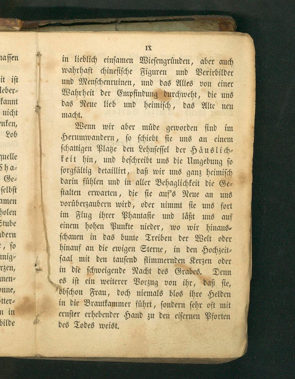 Wenn wir aber müde geworden ſind im Herumwandern, ſo ſchiebt ſie uns an einem ſchattigen Platze den Lehnſeſſel der Häuslich⸗ keit hin, und beſchreibt uns die Umgebung ſo ſorgfältig detaillirt, daß wir uns ganz heimiſch darin fühlen und in aller Behaglichkeit die Ge⸗ ſtalten erwarten, die ſie auf's Neue an uns vorüberzaubern wird, oder nimmt ſie uns fort im Flug ihrer Phantaſie und läßt uns auf einem hohen Punkte nieder, wo wir hinaus⸗ ſchauen in das bunte Treiben der Welt oder hinauf an die ewigen Sterne, in den Hochzeit⸗ ſaal mit den tauſend flimmernden Kerzen oder in die ſchweigende Nacht des Grabes. Denn