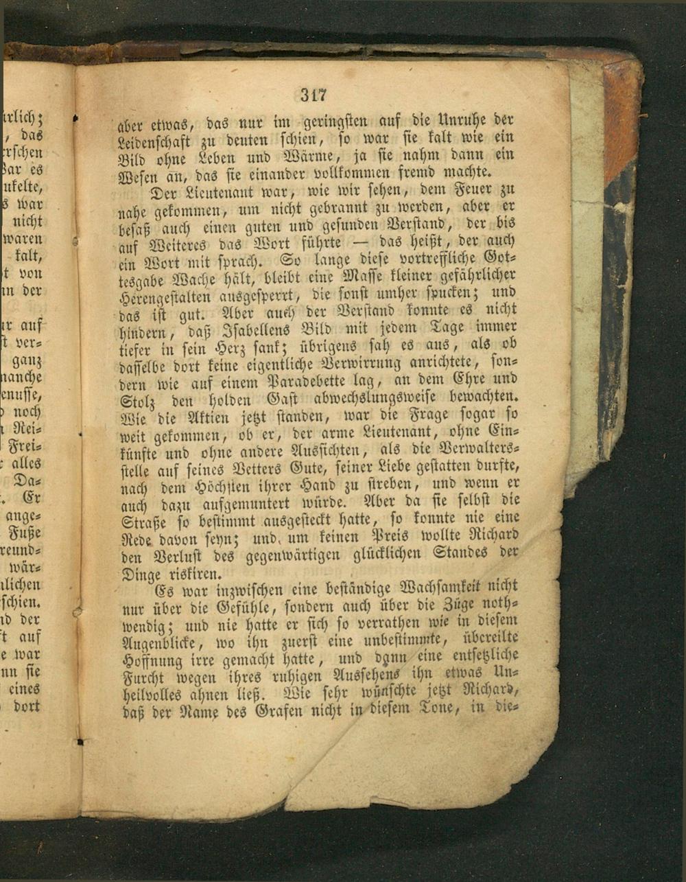 Der Lieutenant war, wie wir ſehen, dem Feuer zu nahe gekommen, um nicht gebrannt zu werden, aber er beſaß auch einen guten und geſunden Verſtand, der bis auf Weiteres das Wort führte— das heißt, der auch ein Wort mit ſprach. So lange dieſe vortreffliche Got⸗ tesgabe Wache hält, bleibt eine Maſſe kleiner gefährlicher Herengeſtalten ausgeſperrt, die ſonſt umher ſpucken; und das iſt gut. Aber auch der Verſtand konnte es nicht hindern, daß Iſabellens Bild mit jedem Tage immer tiefer in ſein Herz ſank; übrigens ſah es aus, als ob daſſelbe dort keine eigentliche Verwirrung anrichtete, ſon⸗ dern wie auf einem Paradebette lag, an dem Ehre und Stolz den holden Gaſt abwechslungsweiſe bewachten. Wie die Aktien jetzt ſtanden, war die Frage ſogar ſo weit gekommen, ob er, der arme Lieutenant, ohne Ein⸗ künfte und ohne andere Ausſichten, als die Verwalters⸗ ſtelle auf ſeines Vetters Gute, ſeiner Liebe geſtatten durfte, nach dem Höchſten ihrer Hand zu ſtreben, und wenn er auch dazu aufgemuntert würde. Aber da ſie ſelbſt die Straße ſo beſtimmt ausgeſteckt hatte, ſo konnte nie eine Rede davon ſeyn; und um keinen Preis wollte Richard den Verluſt des gegenwärtigen glücklichen Standes der Dinge riskiren.
