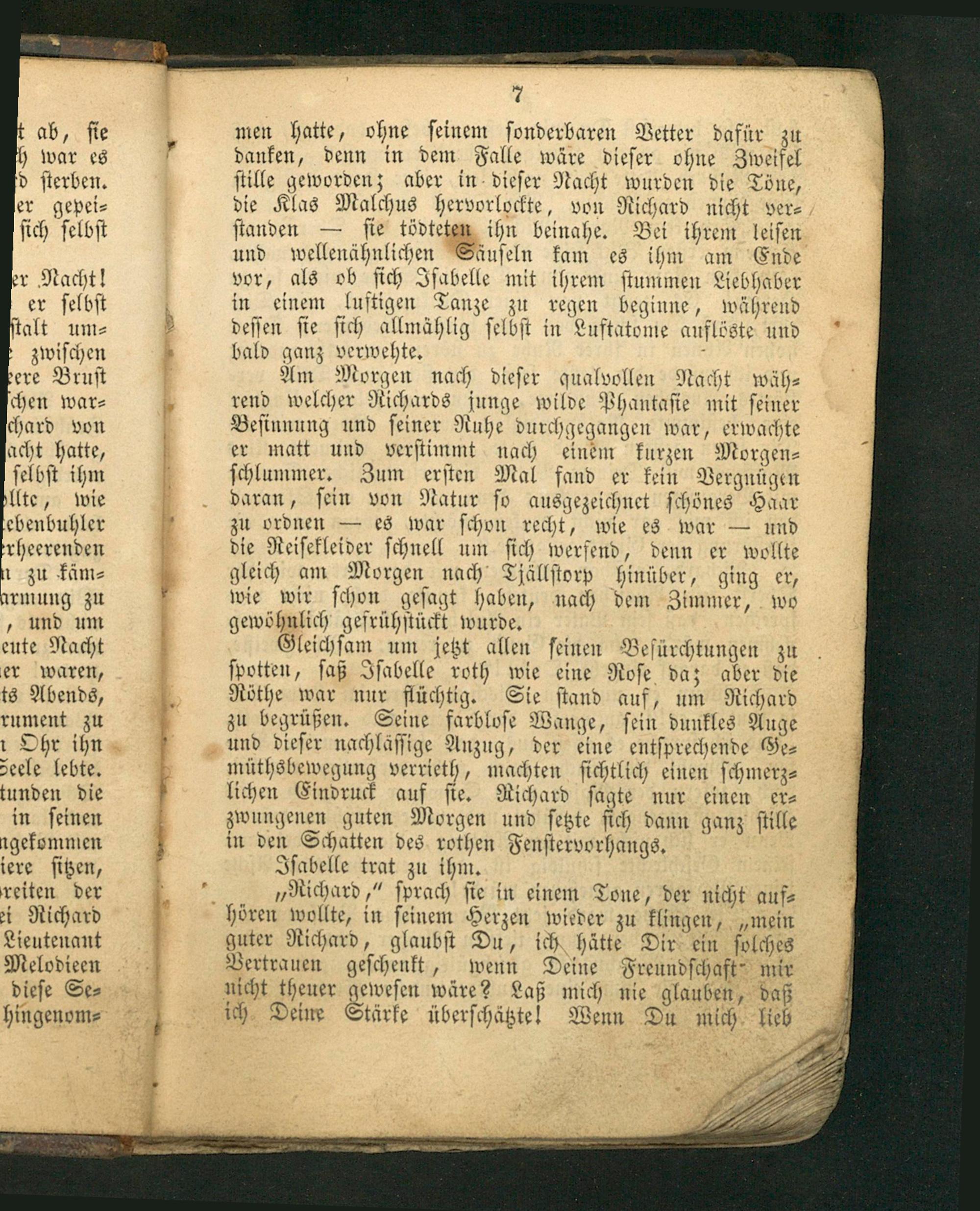Gleichſam um jetzt allen ſeinen Beſürchtungen zu ſpotten, ſaß Iſabelle roth wie eine Roſe da; aber die Röthe war nur flüchtig. Sie ſtand auf, um Richard zu begrüßen. Seine farbloſe Wange, ſein dunkles Auge und dieſer nachläſſige Anzug, der eine entſprechende Ge⸗ müthsbewegung verrieth, machten ſichtlich einen ſchmerz⸗ lichen Eindruck auf ſie. Richard ſagte nur einen er⸗ zwungenen guten Morgen und ſetzte ſich dann ganz ſtille in den Schatten des rothen Fenſtervorhangs.