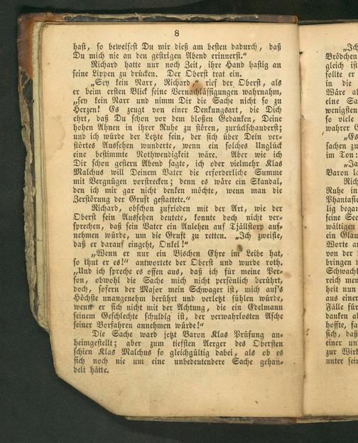 „Sey kein Narr, Richard,“ rief der Oberſt, als er beim erſten Blick ſeine Vernachläſſigungen wahrnahm, „ſey kein Narr und nimm Dir die Sache nicht ſo zu Herzen! Es zeugt von einer Denkungsart, die Dich ehrt, daß Du ſchon vor dem bloßen Gedanken, Deine hohen Ahnen in ihrer Ruhe zu ſtören, zurückſchauderſt; und ich würde der Letzte ſein, der ſich üͤber Dein ver⸗ ſtörtes Ausſehen wunderte, wenn ein ſolches Unglück eine beſtimmte Nothwendigkeit wäre. Aber wie ich Dir ſchon geſtern Abend ſagte, ich oder vielmehr Klas Malchus will Deinem Vater die erforderliche Summe mit Vergnügen vorſtrecken; denn es waͤre ein Skandal, den ich mir gar nicht denken möchte, wenn man die Zerſtörung der Gruft geſtattete.“