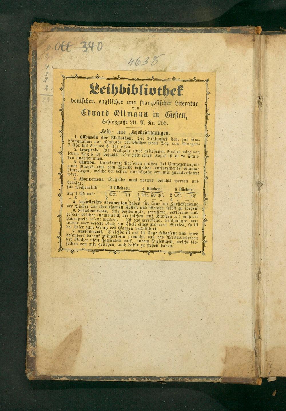8„ 2„ 7 3„—„„—„ fs 5. Auswärtige Abonnenten haben für Hin⸗ und Zurückſendung der Bücher auf ihre eigenen Koſten und Gefahr ſelbſt zu ſorgen. 6. Schadenersatz. Für beſchmutzte, zerriſſene, verlorene und —defecte Bücher(namentlich bei ſolchen mit Kupfern ꝛc.) muß der ) Ladenpreis erſetzt werden.— Iſt das zerriſſene, beſchmutzte, ver⸗ T lorene oder defecte Buch ein Theil eines größeren Werkes, ſo iſt t der Leſer zum Erſatz des Ganzen verpflichtet. „ 7. Ausleihezeit. Dieſelbe iſt auf 14 Tage feſtgeſetzt und wird —beſonders darauf aufmerkſam gemacht, daß das Weiterverleihen „der Bücher nicht ſtattfinden darf, indem Diejenigen, welche die⸗ ſelben von mir geliehen, auch dafür zu ſtehen haben.