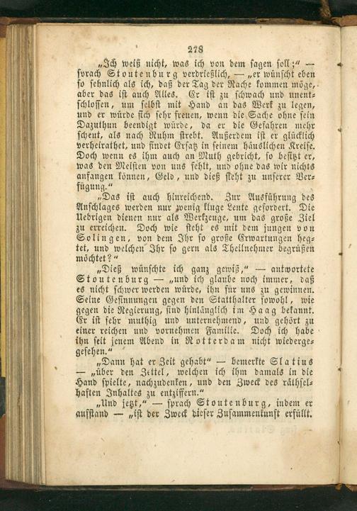 „Dieß wünſchte ich ganz gewiß,“— antwortete Stoutenburg—„und ich glaube noch immer, daß es nicht ſchwer werden würde, ihn für uns zu gewinnen. Seine Geſinnungen gegen den Statthalter ſowohl, wie gegen die Regierung, ſind hinlänglich im Haag bekannt. Er iſt ſehr muthig und unternehmend, und gehört zu einer reichen und vornehmen Familie. Doch ich habe ihn ſeit jenem Abend in Rotterdam nicht wiederge⸗ geſehen.“