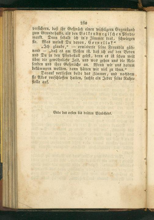 280 verſichern, daß ihr Geſpräch einen wichtigern Gegenſtand zum Grunde hatte, als den Volkenbu rgiſchen Pferde⸗ markt. Denn ſobald ich in's Zimmer trat, ſchwiegen ſie. Was meinſt Du davon, Cornelia?“ „Ich glaube,“— erwiederte ſeine Freundin gäh⸗ nend—„daß es am Beſten iſt, daß ich auf den Boden und Du in den Pferdeſtall gehſt, denn es iſt ſchon weit über die gewöhnliche Zeit, und was gehen uns die Rei⸗ ſenden und ihre Geſpräche an. Wenn wir uns darum bekümmern wollten, dann hätten wir viel zu thun.“ Darauf verließen beide das Zimmer, und nachdem ſie Alles verſchloſſen hatten, ſuchte ein Jeder ſeine Ruhe⸗ ſtelle auf.