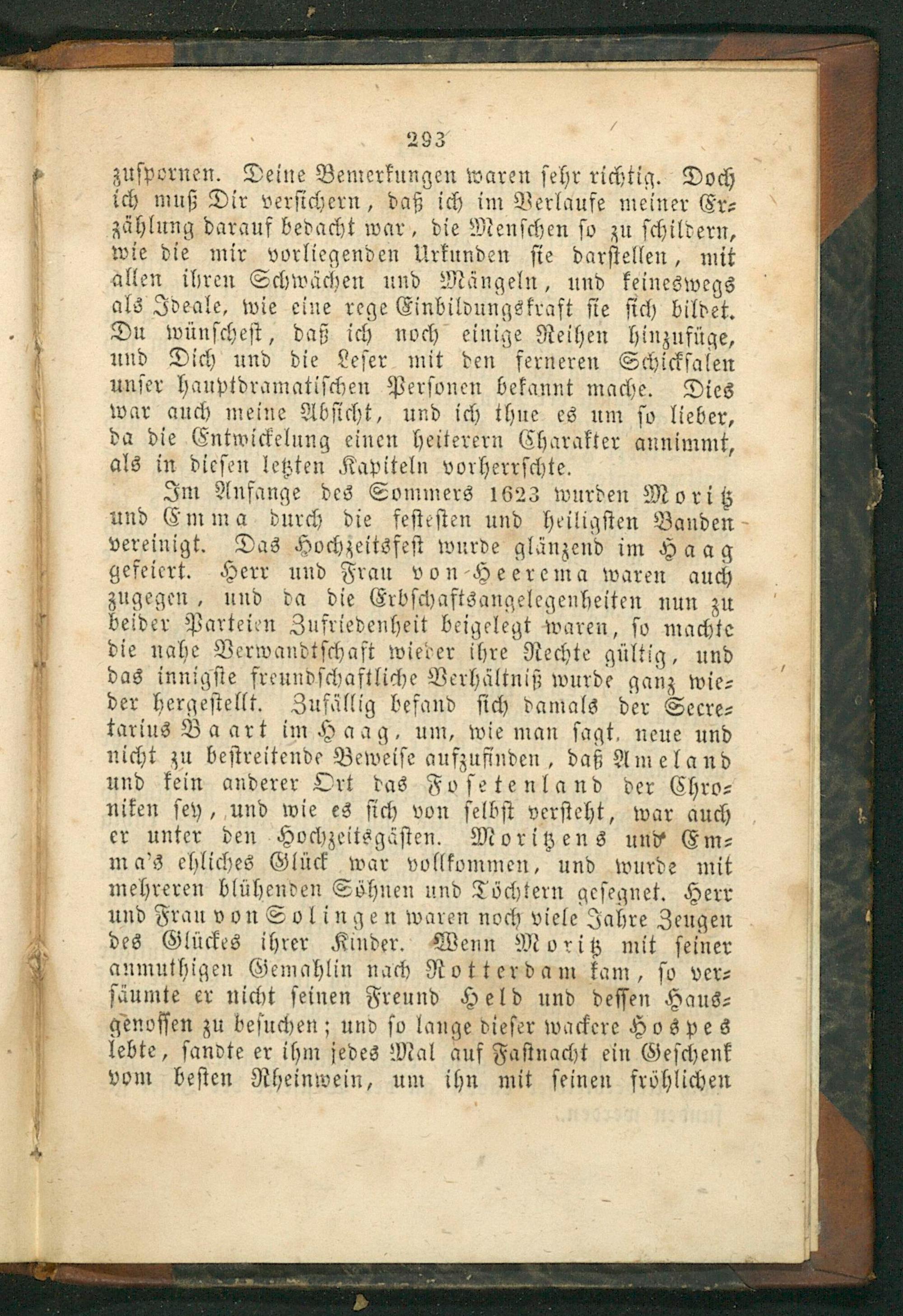 Im Anfange des Sommers 1623 wurden Moritz und Emma durch die feſteſten und heiligſten Banden vereinigt. Das Hochzeitsfeſt wurde glänzend im Haag gefeiert. Herr und Frau von Heerema waren auch zugegen, und da die Erbſchaftsangelegenheiten nun zu beider Parteien Zufriedenheit beigelegt waren, ſo machte die nahe Verwandtſchaft wieder ihre Rechte gültig, und das innigſte freundſchaftliche Verhältniß wurde ganz wie⸗ der hergeſtellt. Zufällig befand ſich damals der Secre⸗ tarius Baart im Haag, um, wie man ſagt, neue und nicht zu beſtreitende Beweiſe aufzufinden, daß Ameland und kein anderer Ort das Foſetenland der Chro⸗ niken ſey, und wie es ſich von ſelbſt verſteht, war auch er unter den Hochzeitsgäſten. Moritzens und Em⸗ ma's ehliches Glück war vollkommen, und wurde mit mehreren blühenden Söhnen und Töchtern geſegnet. Herr und Frau von Solingen waren noch viele Jahre Zeugen des Glückes ihrer Kinder. Wenn Moritz mit ſeiner anmuthigen Gemahlin nach Rotterdam kam, ſo ver⸗ ſäumte er nicht ſeinen Freund Held und deſſen Haus⸗ genoſſen zu beſuchen; und ſo lange dieſer wackere Hospes lebte, ſandte er ihm jedes Mal auf Faſtnacht ein Geſchenk vom beſten Rheinwein, um ihn mit ſeinen fröhlichen