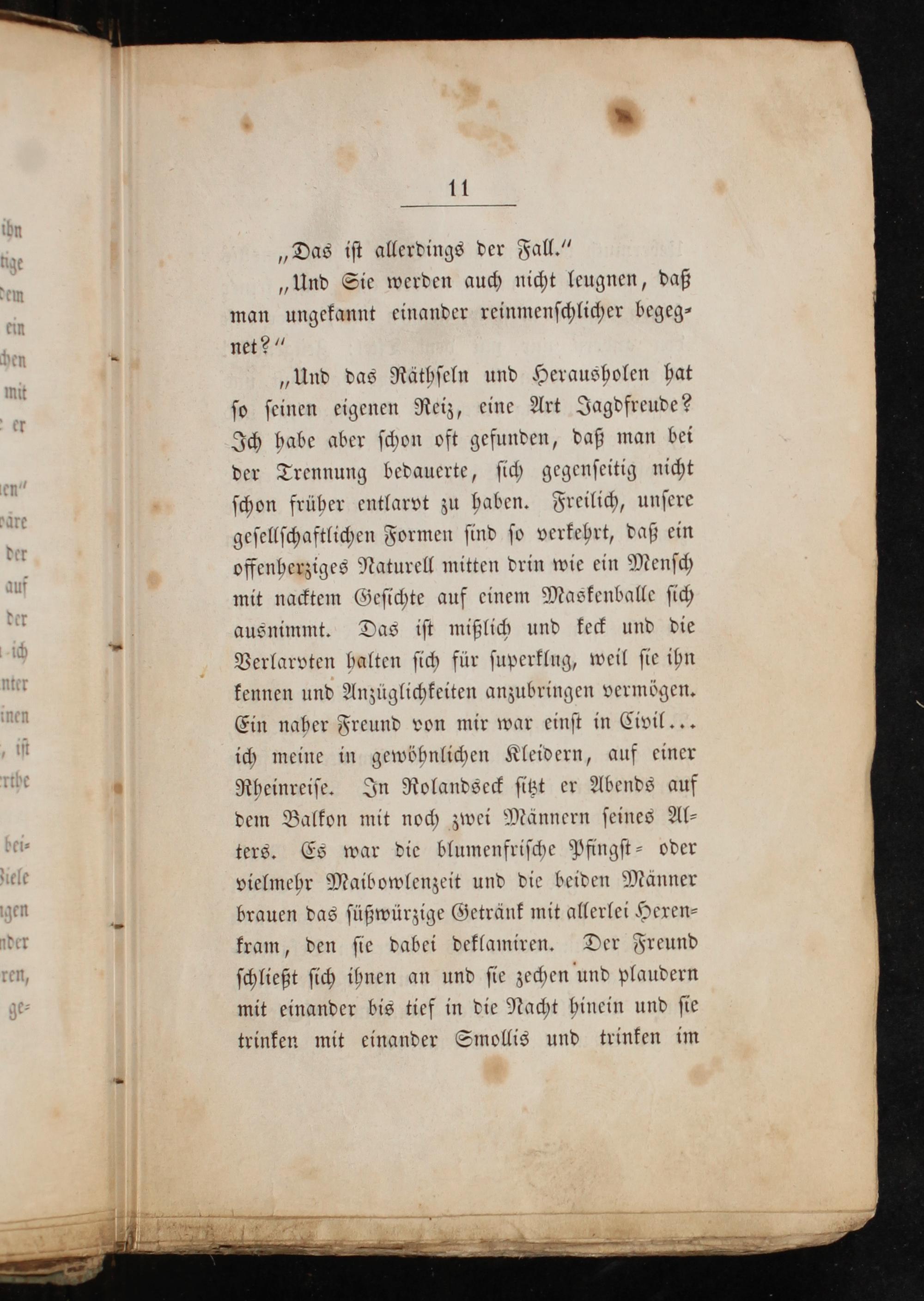 ſchon früher entlarvt zu haben. Freilich, unſere geſellſchaftlichen Formen ſind ſo verkehrt, daß ein offenherziges Naturell mitten drin wie ein Menſch mit nacktem Geſichte auf einem Maskenballe ſich ausnimmt. Das iſt mißlich und keck und die Verlarpten halten ſich für ſuperklug, weil ſie ihn kennen und Anzüglichkeiten anzubringen vermögen. Ein naher Freund von mir war einſt in Civil... ich meine in gewöhnlichen Kleidern, auf einer * Rheinreiſe. In Rolandseck ſitzt er Abends auf dem Balkon mit noch zwei Männern ſeines Al⸗ ters. Es war die blumenfriſche Pfingſt- oder vielmehr Maibowlenzeit und die beiden Männer brauen das ſüßwürzige Getränk mit allerlei Heren⸗