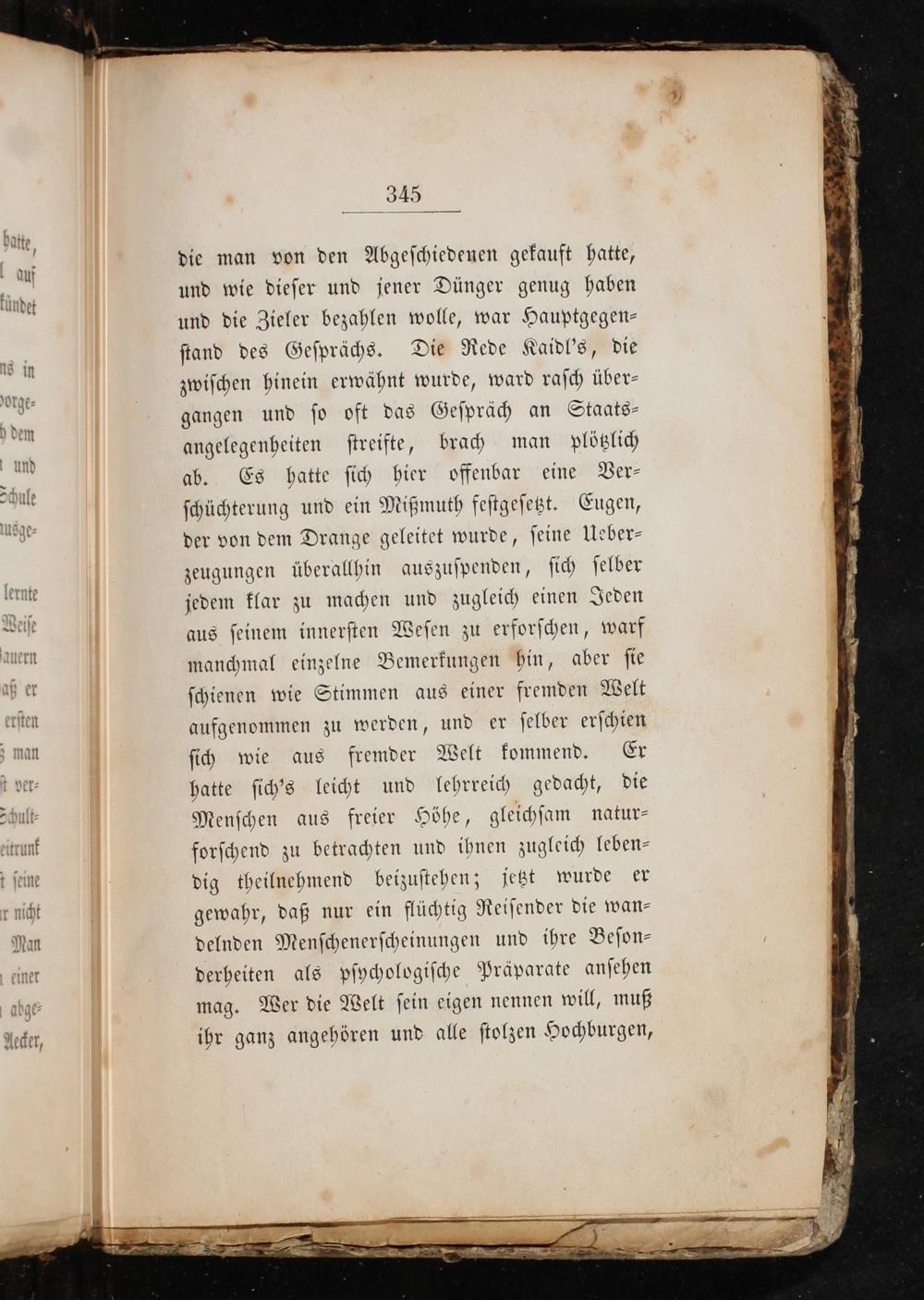 345 die man von den Abgeſchiedenen gekauft hatte, und wie dieſer und jener Dünger genug haben und die Zieler bezahlen wolle, war Hauptgegen⸗ ſtand des Geſprächs. Die Rede Kaidl's, die zwiſchen hinein erwähnt wurde, ward raſch über⸗ gangen und ſo oft das Geſpräch an Staats⸗ angelegenheiten ſtreifte, brach man plötzlich ab. Es hatte ſich hier offenbar eine Ver⸗ ſchüchterung und ein Mißmuth feſtgeſetzt. Eugen, der von dem Drange geleitet wurde, ſeine Ueber⸗ zeugungen überallhin auszuſpenden, ſich ſelber jedem klar zu machen und zugleich einen Jeden aus ſeinem innerſten Weſen zu erforſchen, warf manchmal einzelne Bemerkungen hin, aber ſie ſchienen wie Stimmen aus einer fremden Welt aufgenommen zu werden, und er ſelber erſchien ſich wie aus fremder Welt kommend. Er hatte ſich's leicht und lehrreich gedacht, die Menſchen aus freier Höhe, gleichſam natur⸗ forſchend zu betrachten und ihnen zugleich leben⸗ dig theilnehmend beizuſtehen; jetzt wurde er gewahr, daß nur ein flüchtig Reiſender die wan⸗ delnden Menſchenerſcheinungen und ihre Beſon⸗ derheiten als pſychologiſche Präparate anſehen mag. Wer die Welt ſein eigen nennen will, muß ihr ganz angehören und alle ſtolzen Hochburgen,