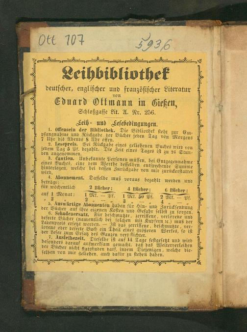 3.(Caution. Unbekannte Perſonen müſſen, bei Entgegennahme eines Buches, eine dem Werthe deſſelben entſprchende Summe hinterlegen, welche bei deſſen Zurückgabe von mir zurückerſtattet wird.—